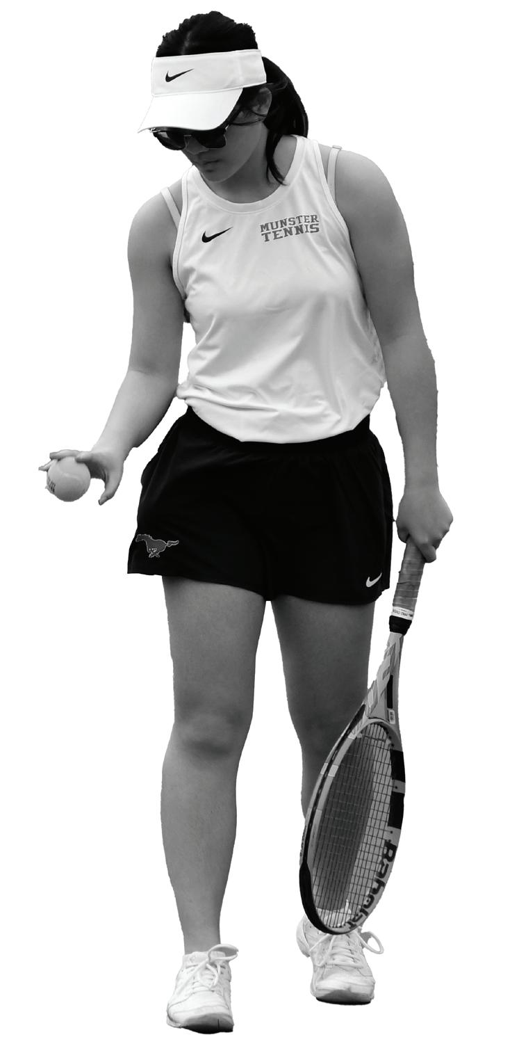 STEPPING FORWARD Preparing to serve to her Crown Point opponent, Claire Han, junior, bounces the ball. This was her first match of her junior year season. (photo by marianna young)