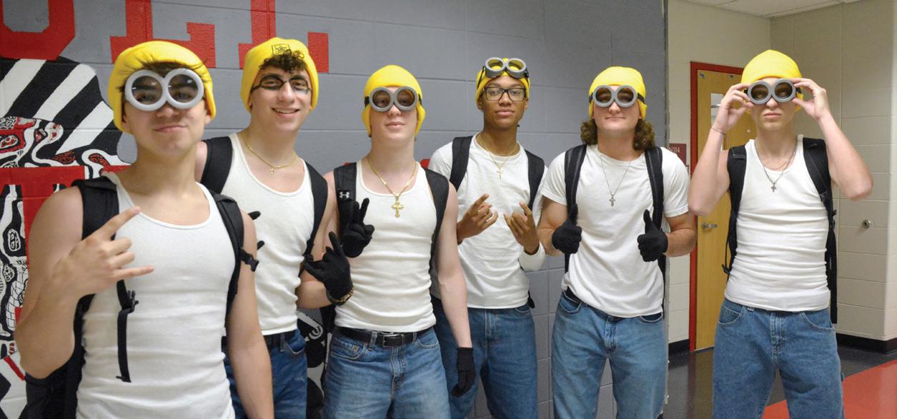 MINION MAHEIM Posing in front of the Mustang mural, seniors Lucas Collier Isaiah Swider, Brandon Petrovski, Myles Shipps, Sam Marich, and Vasili Papageorge dress up as a clan of Minions. (photo by john kullerstrand)