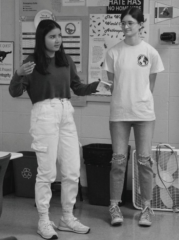 HERE’S THE SCOOP Standing in front of the class during the April 11 Environmental Club meeting, seniors Lily Hestjean and Eden Cook, explain the preparation needed for the upcoming Earth Day event. (photo by john kullerstrand)