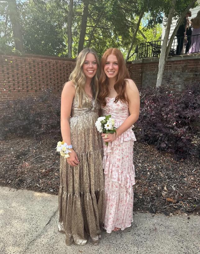 Claire Leiter and Lauren Poston are pictured during Marietta’s 2023 prom. Their dress are the perfect depiction of picnic style dresses. The floral pattern and flowy materials of the dresses match the season of spring.