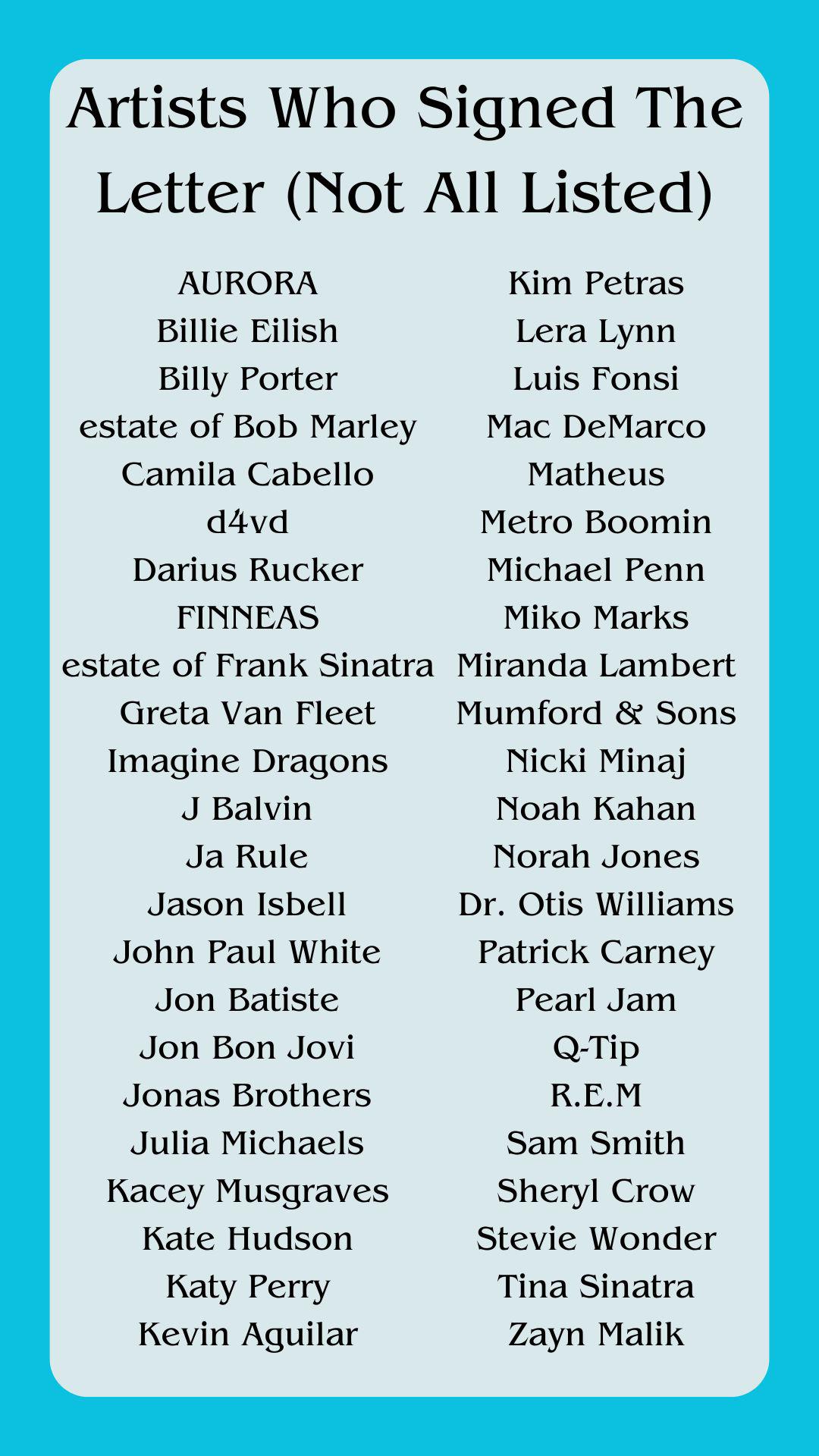 Over 200 artists signed this letter which include but is not limited to Billie Eilish, R.E.M, Nicki Minaj, Jon Bon Jovi and Smokey Robinson. This came to fruition from people’s ability to generate various artists singing songs that they’ve never sang before. Also, it derives from the usage of the average person having the ability to generate music of decent quality relatively easily.