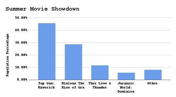 Students participated in a survey choosing their favorite movie from the year. Top Gun: Maverick won overall best film, with 45.7% of total votes. Minions The Rise of Gru got 28.7% of student votes, Thor Love and Thunder received 11.7%, and Jurassic World: Dominion received 5.7%. The survey had an “other” section where MHS students could type in their favorite movie if the survey didn’t include their top movie choice. Those honorable mentions are Nope, Elvis, Where the Crawdads Sing, and Purple Hearts. The “other” category made up 8.2% of the votes.
