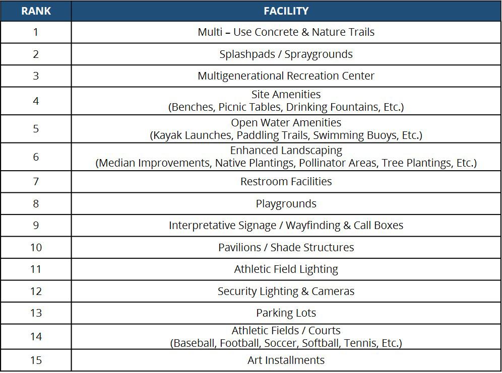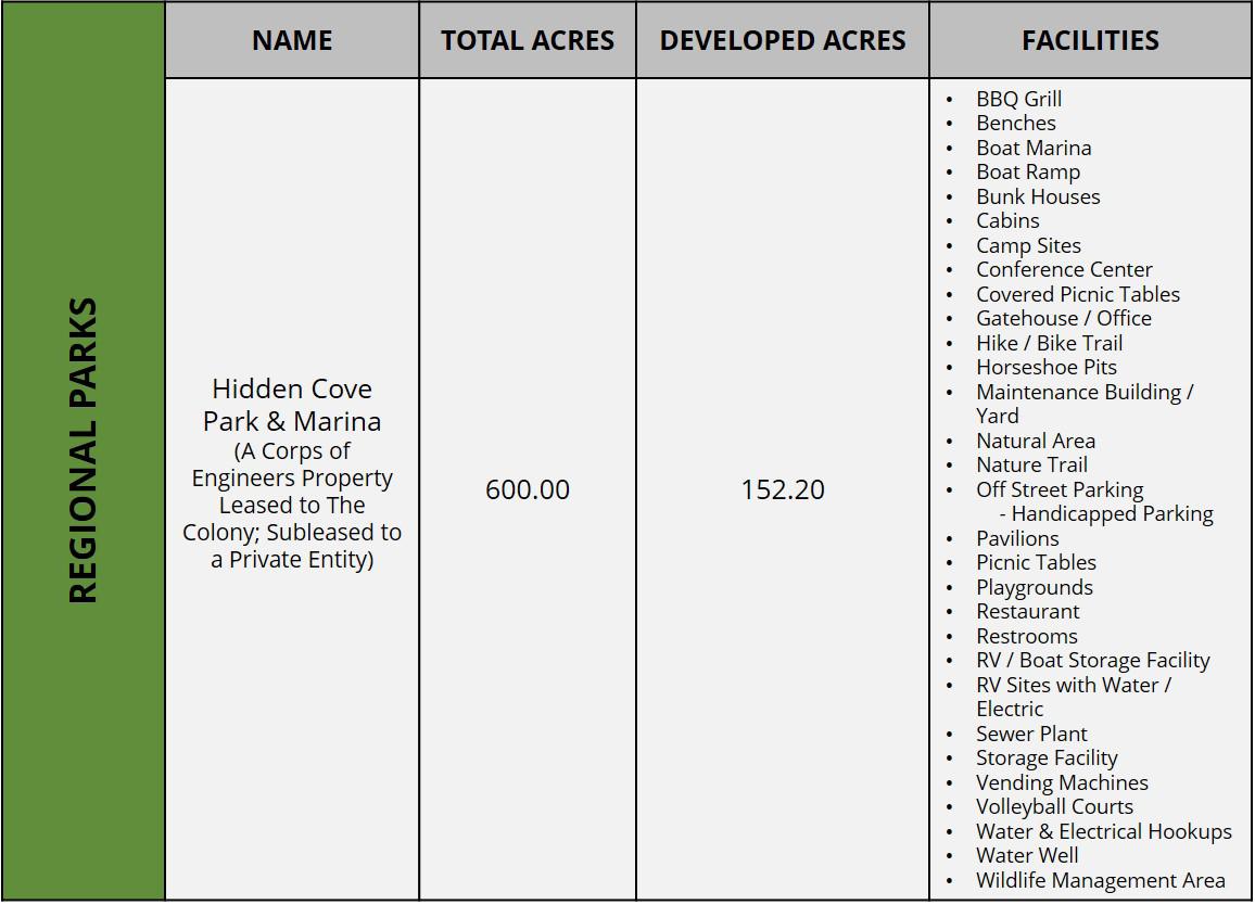 The following table represents the projected recreational facilities priorities for The Colony’s Park System. These priorities are based on information gathered from the citizen survey, focus group meetings, public input meetings, the CDC Board, City Staff and professional opinion.