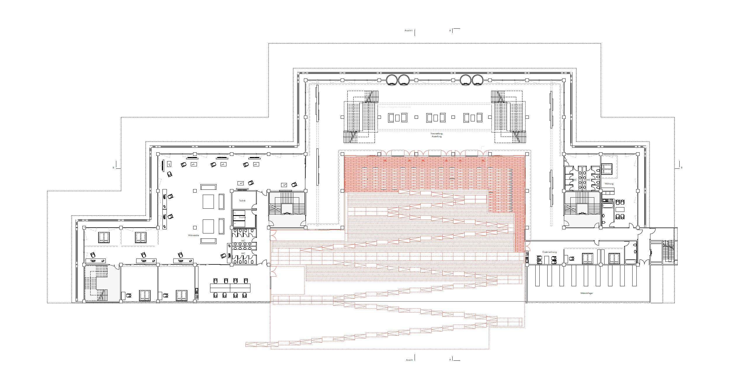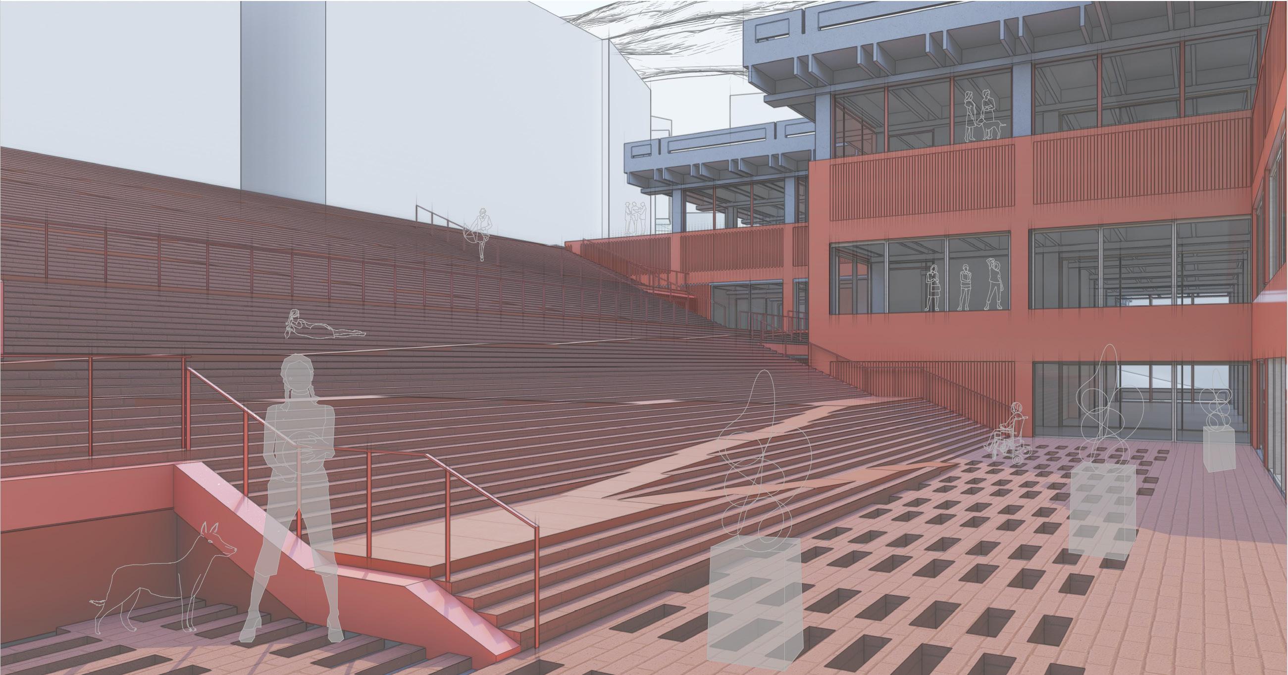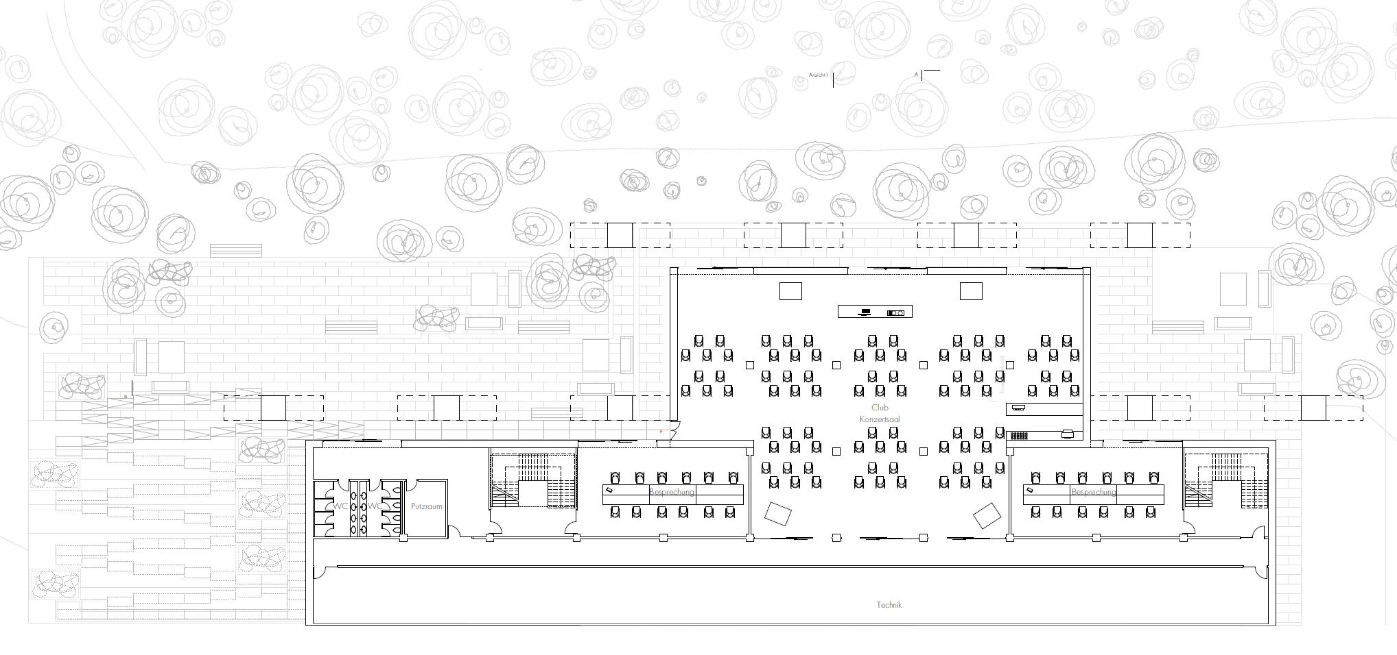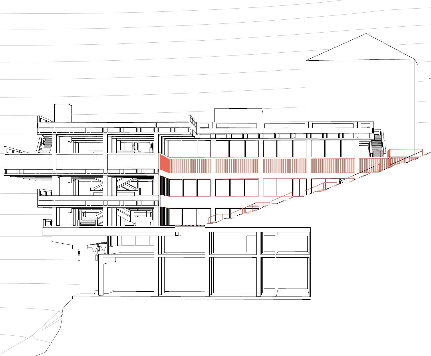 The brutalist congress center in Bad Gastein is known as a lost place. By opening the building on the slope side in a southerly direction, the quality of the historic building is intended to be visible to the public. The large barrier-free staircase offers a special view of the existing building, offers unique situations with small inner courtyards and separate entrances and creates a public outdoor area with a panoramic view. Due to the strong contrast caused by the material, the intervention stands out clearly from the existing structure and thus does not distort the history. The new concept for the building includes a use for residential artists but also the public. Large studio rooms, residential units and exhibition rooms can be flexibly connected and separated in order to be able to react to the individual needs of the artists. while the public areas are arranged to be easily accessible, revitalizing the building and at the same time providing a retreat for the artists.