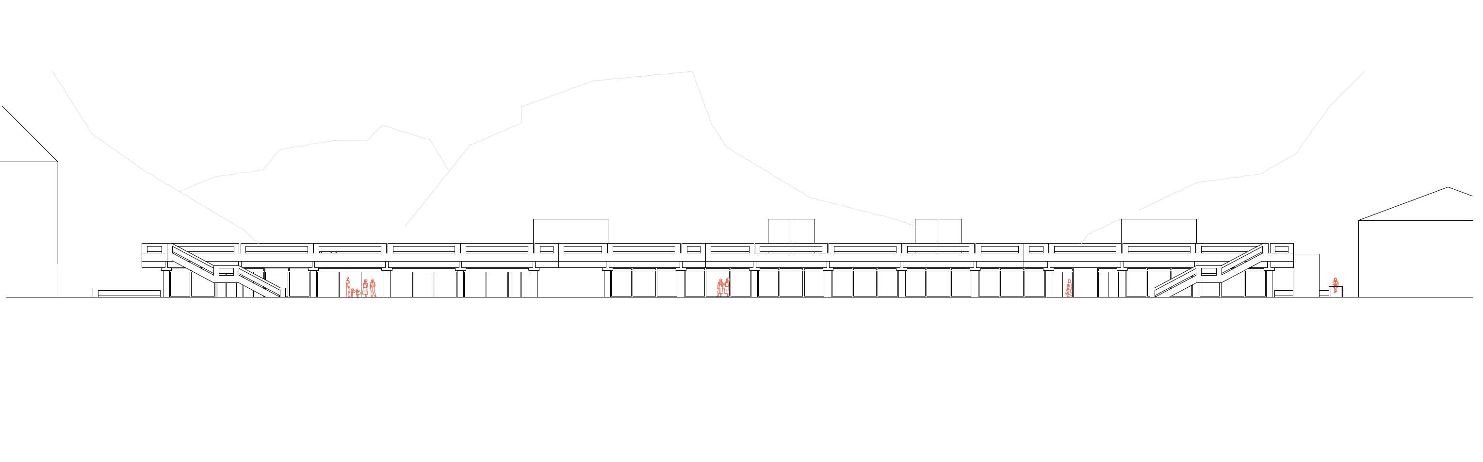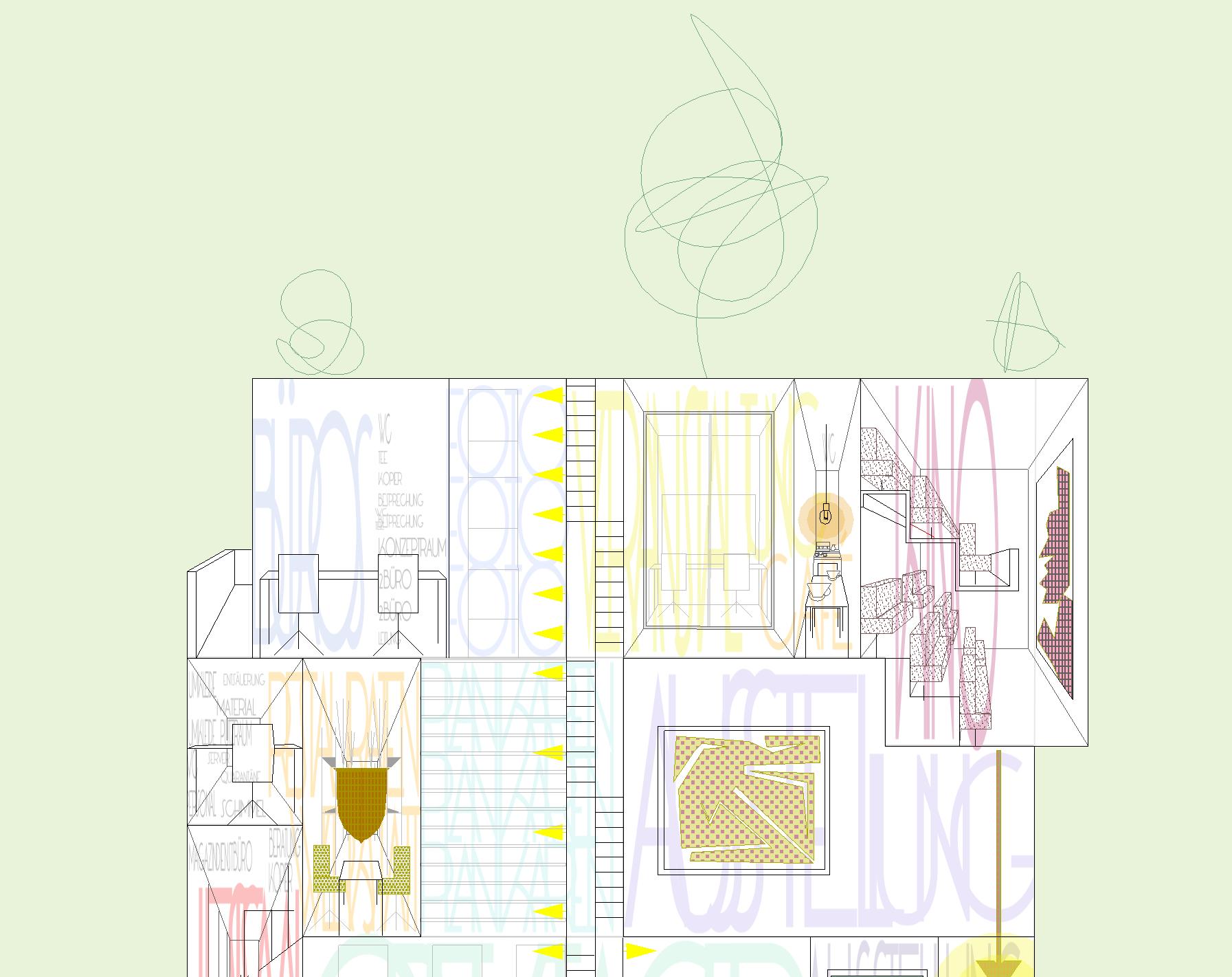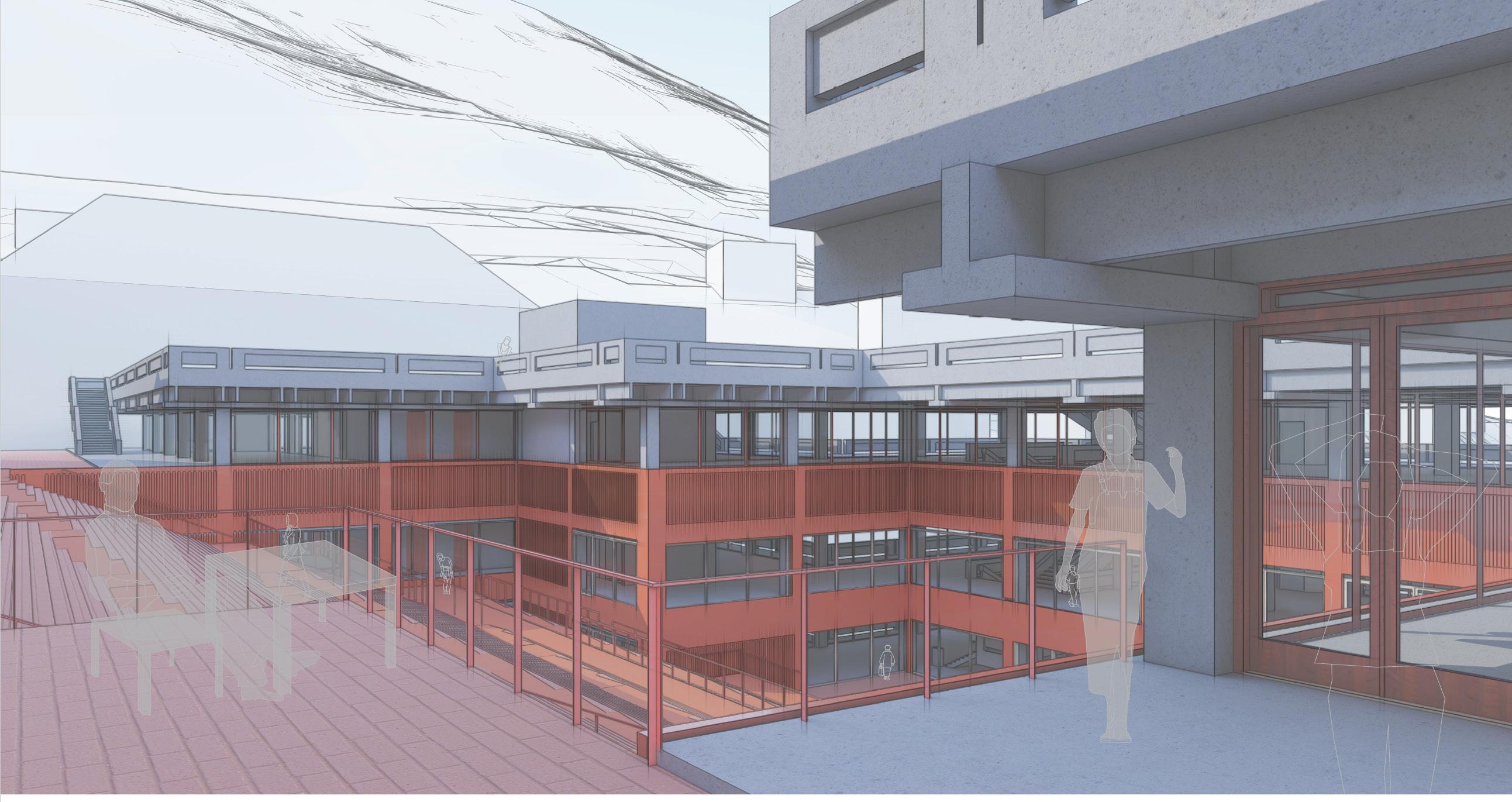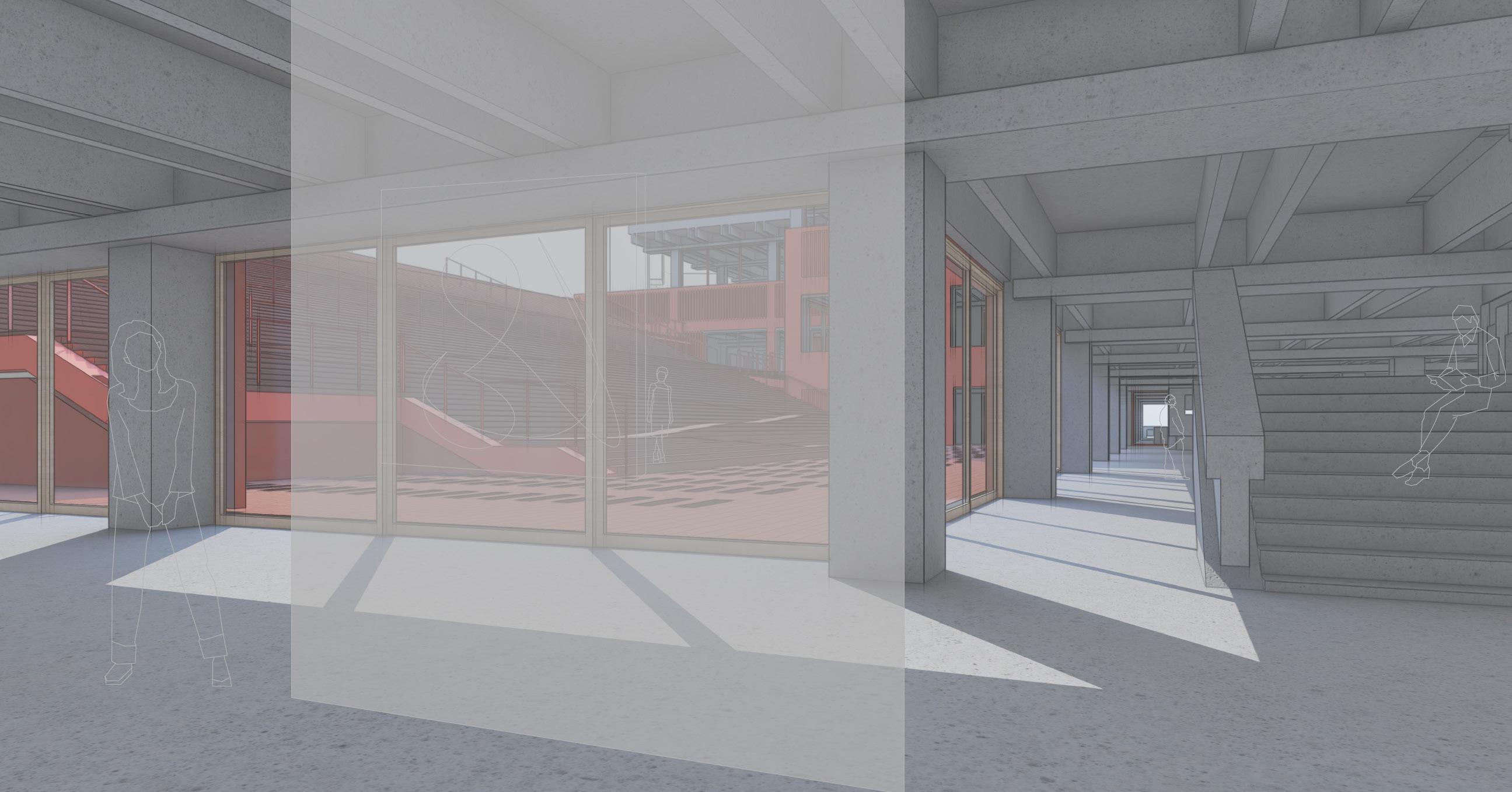 The brutalist congress center in Bad Gastein is known as a lost place. By opening the building on the slope side in a southerly direction, the quality of the historic building is intended to be visible to the public. The large barrier-free staircase offers a special view of the existing building, offers unique situations with small inner courtyards and separate entrances and creates a public outdoor area with a panoramic view. Due to the strong contrast caused by the material, the intervention stands out clearly from the existing structure and thus does not distort the history. The new concept for the building includes a use for residential artists but also the public. Large studio rooms, residential units and exhibition rooms can be flexibly connected and separated in order to be able to react to the individual needs of the artists. while the public areas are arranged to be easily accessible, revitalizing the building and at the same time providing a retreat for the artists.