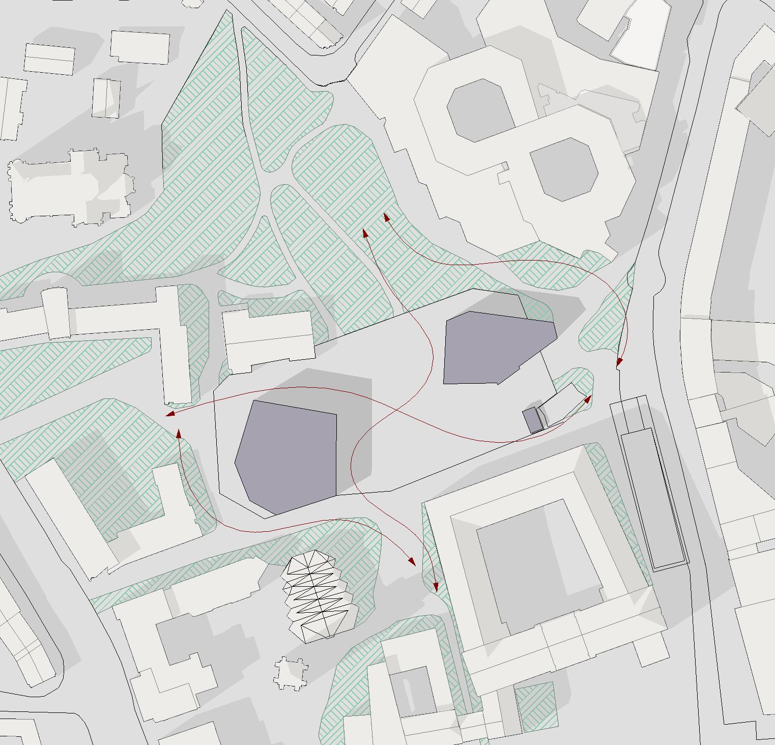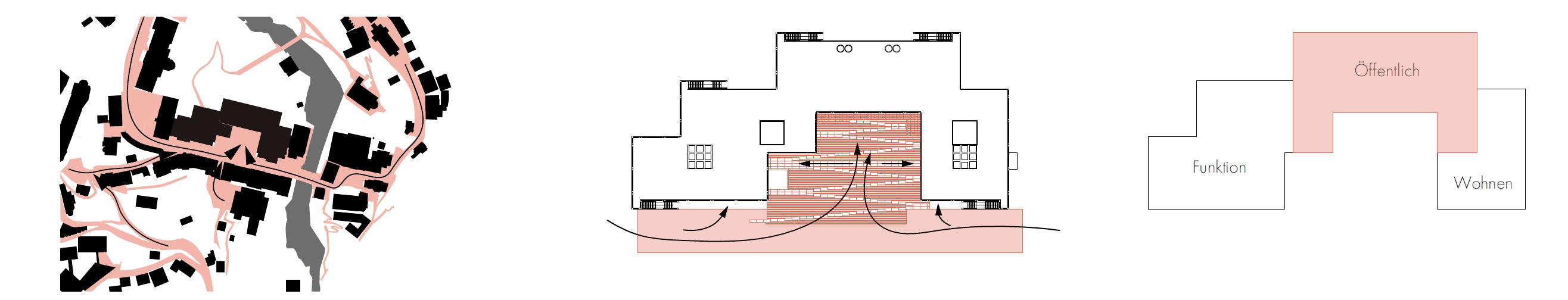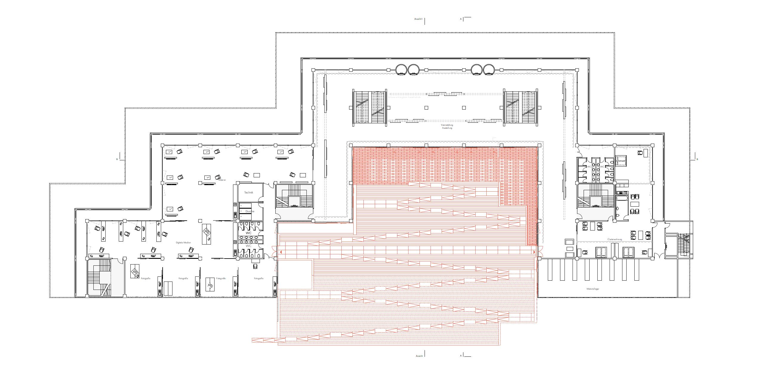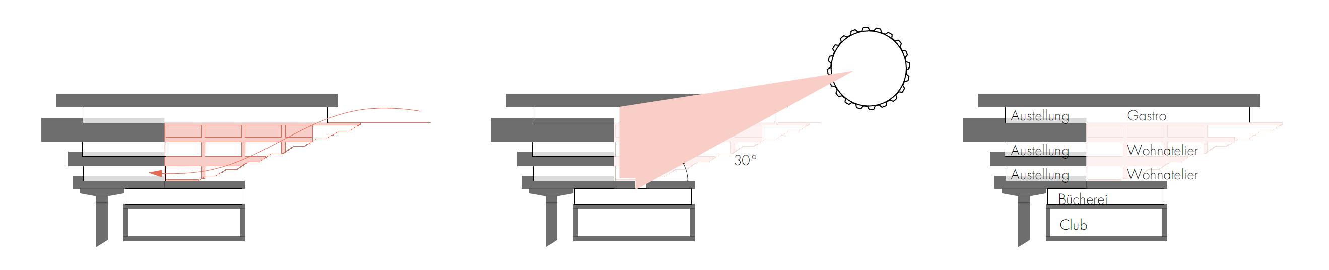 The brutalist congress center in Bad Gastein is known as a lost place. By opening the building on the slope side in a southerly direction, the quality of the historic building is intended to be visible to the public. The large barrier-free staircase offers a special view of the existing building, offers unique situations with small inner courtyards and separate entrances and creates a public outdoor area with a panoramic view. Due to the strong contrast caused by the material, the intervention stands out clearly from the existing structure and thus does not distort the history. The new concept for the building includes a use for residential artists but also the public. Large studio rooms, residential units and exhibition rooms can be flexibly connected and separated in order to be able to react to the individual needs of the artists. while the public areas are arranged to be easily accessible, revitalizing the building and at the same time providing a retreat for the artists.