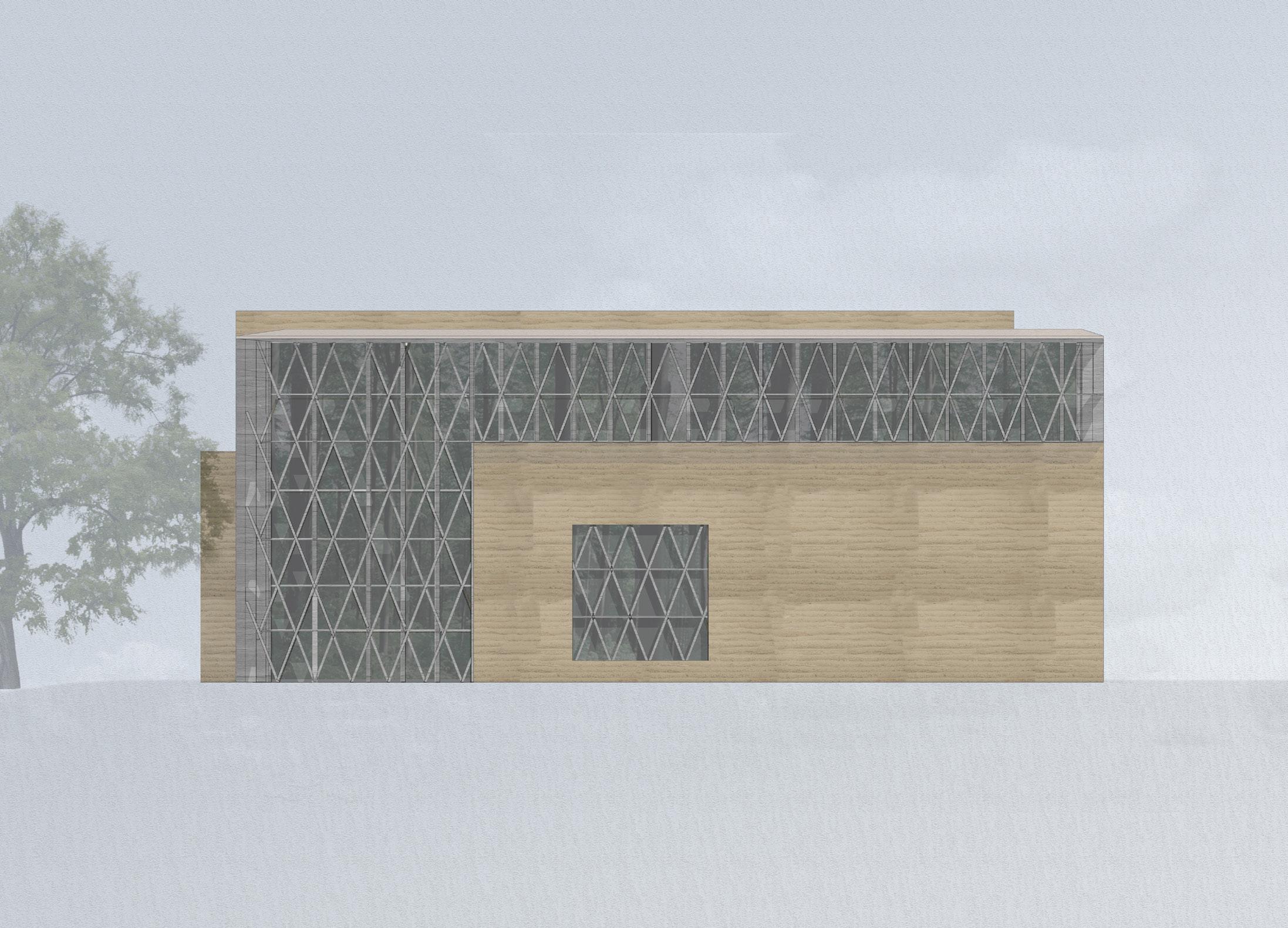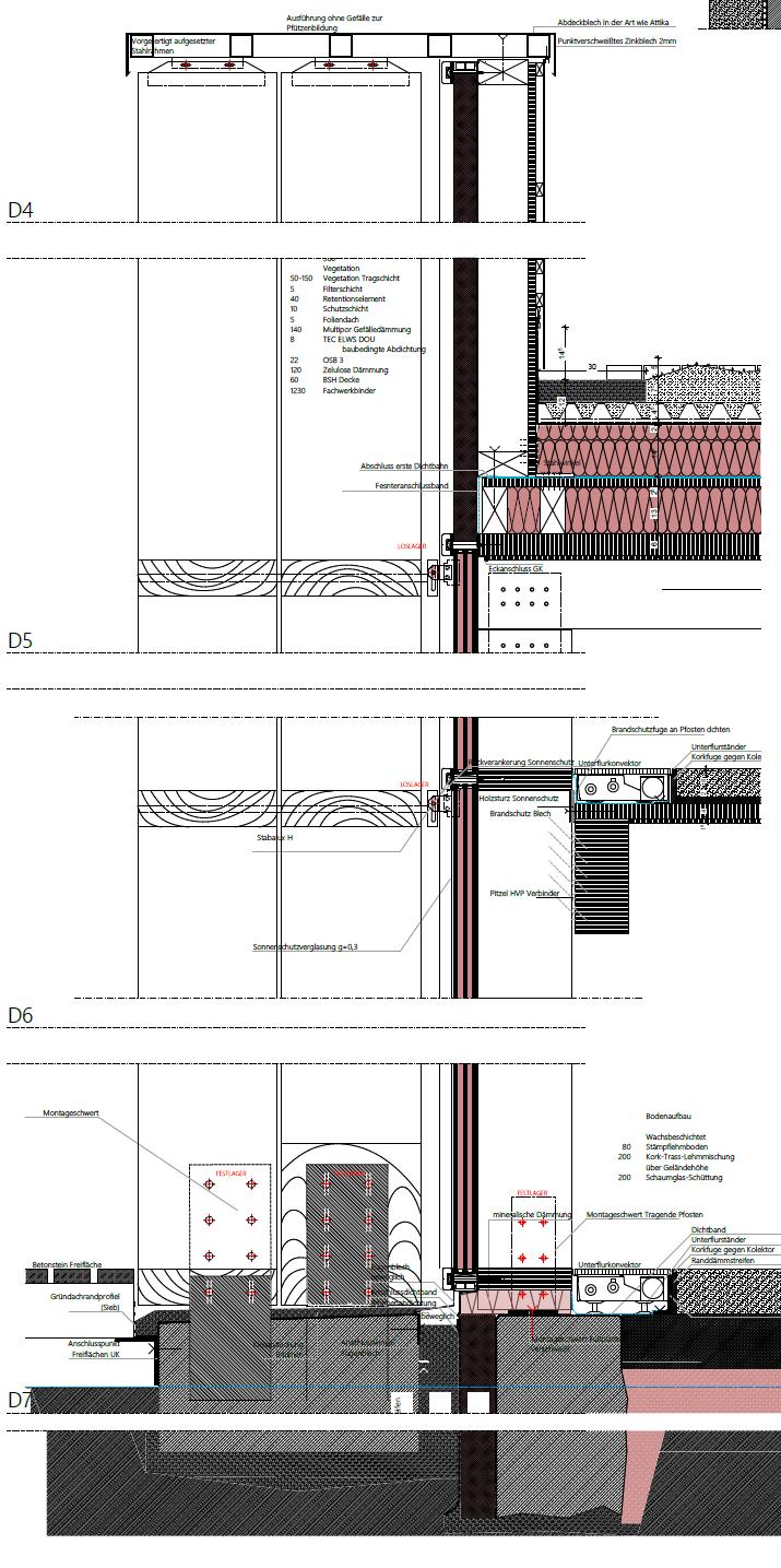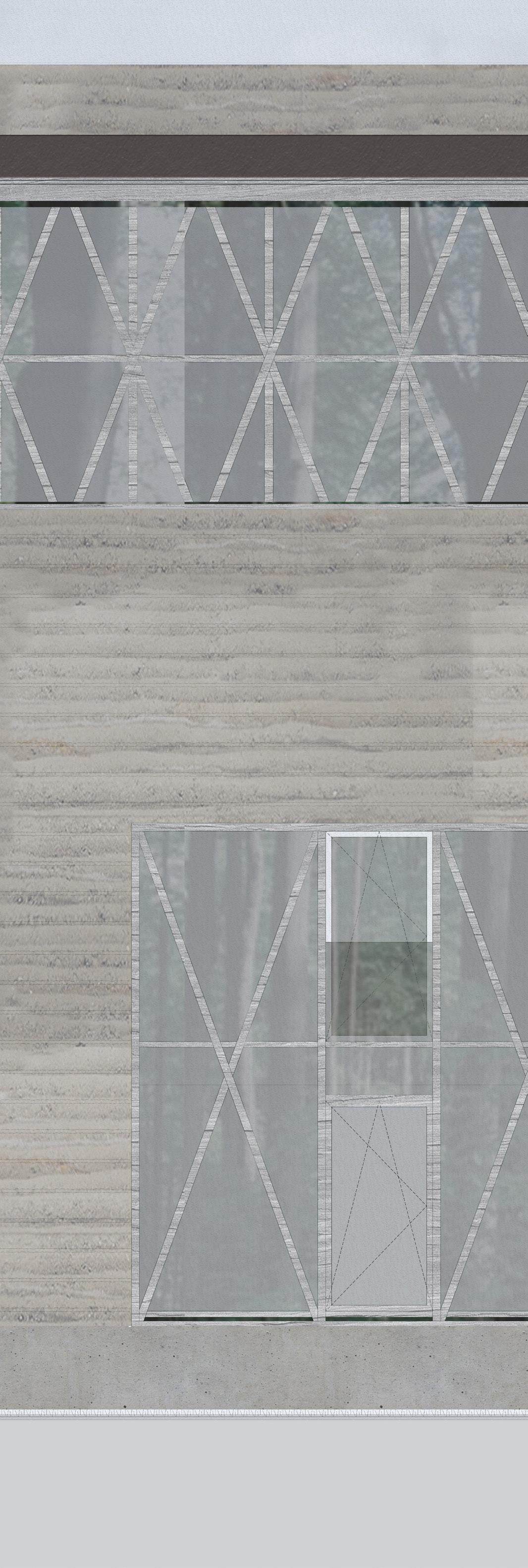at the end of the course, the structural project brings together the disciplines of design, construction, statics, building technology and building physics. the selected materials clay and wood are intended to show new ways of building. the rammed earth bulkheads, which are braced by wooden beam ceilings with laminated veneer lumber, provide the form. the sun protection incorporated into the design in front of the glass facades serves to optimize energy consumption. two safety stairwells guarantee fire-safe escape routes from the event hall.