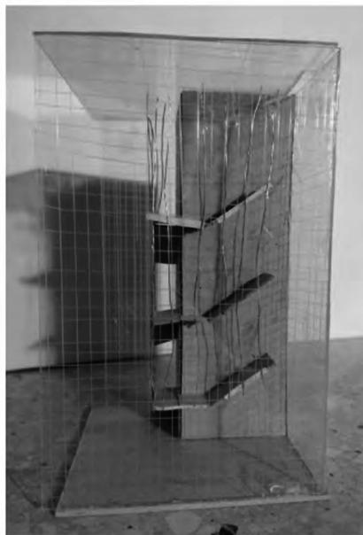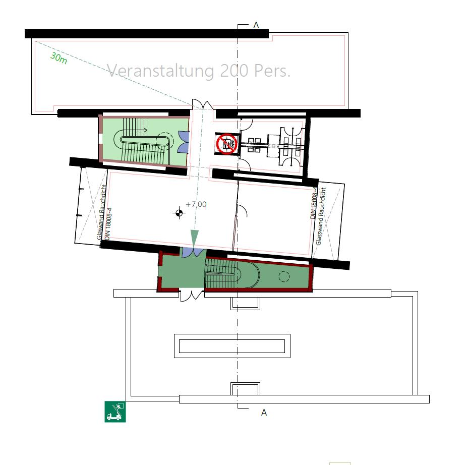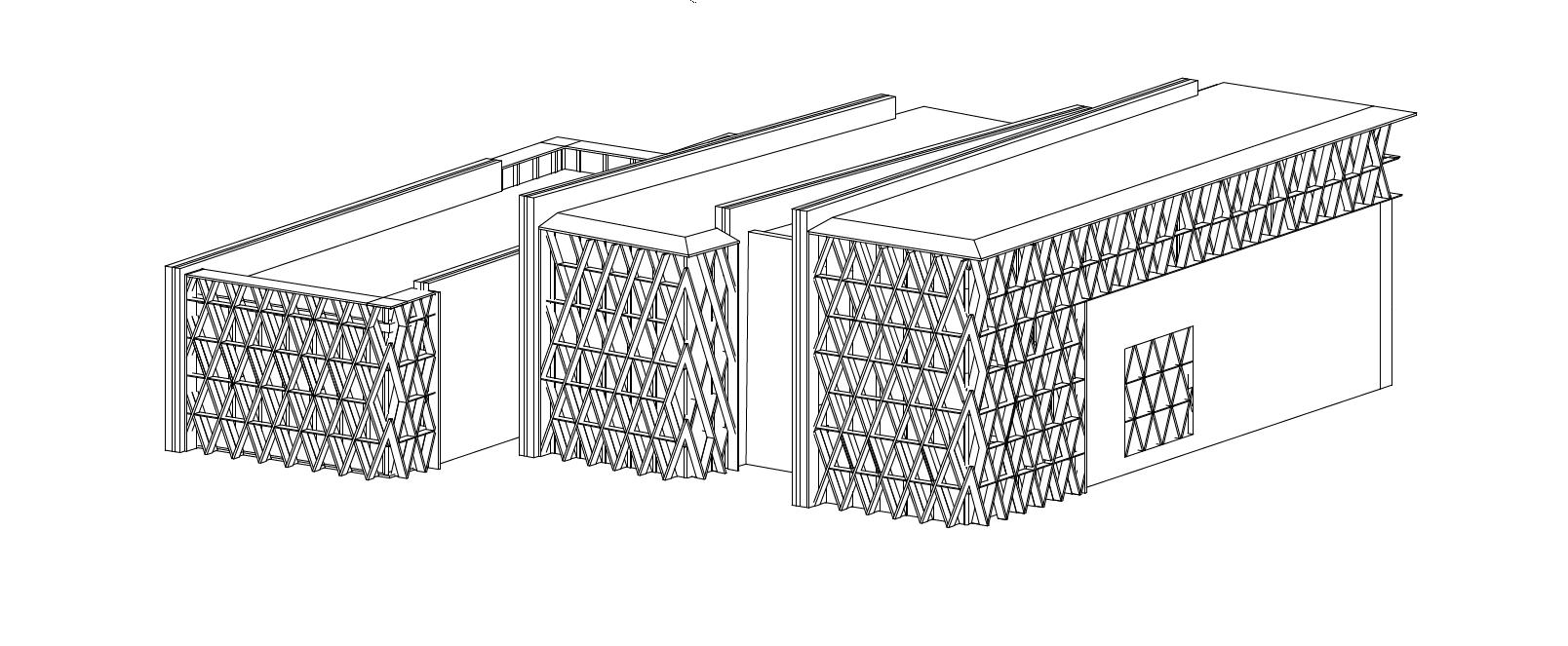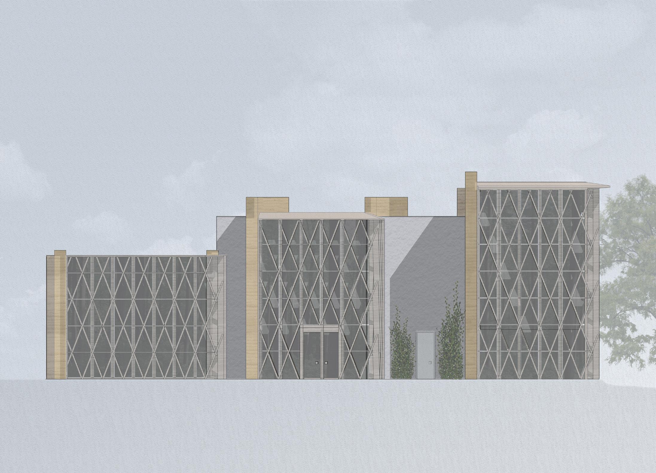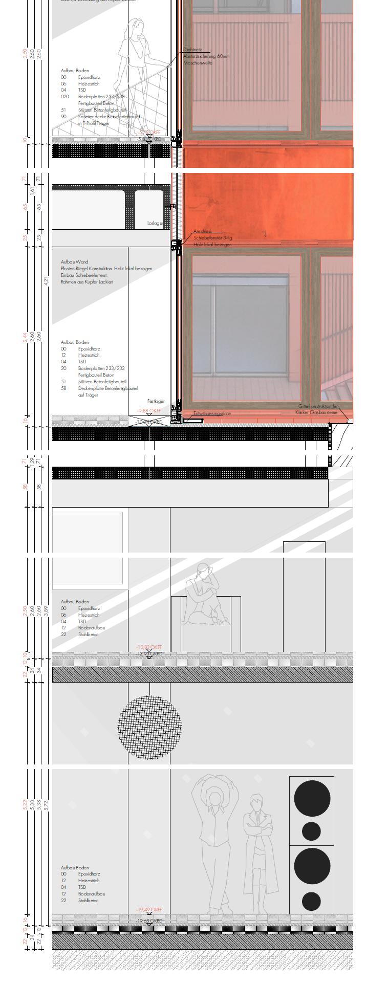 at the end of the course, the structural project brings together the disciplines of design, construction, statics, building technology and building physics. the selected materials clay and wood are intended to show new ways of building. the rammed earth bulkheads, which are braced by wooden beam ceilings with laminated veneer lumber, provide the form. the sun protection incorporated into the design in front of the glass facades serves to optimize energy consumption. two safety stairwells guarantee fire-safe escape routes from the event hall.