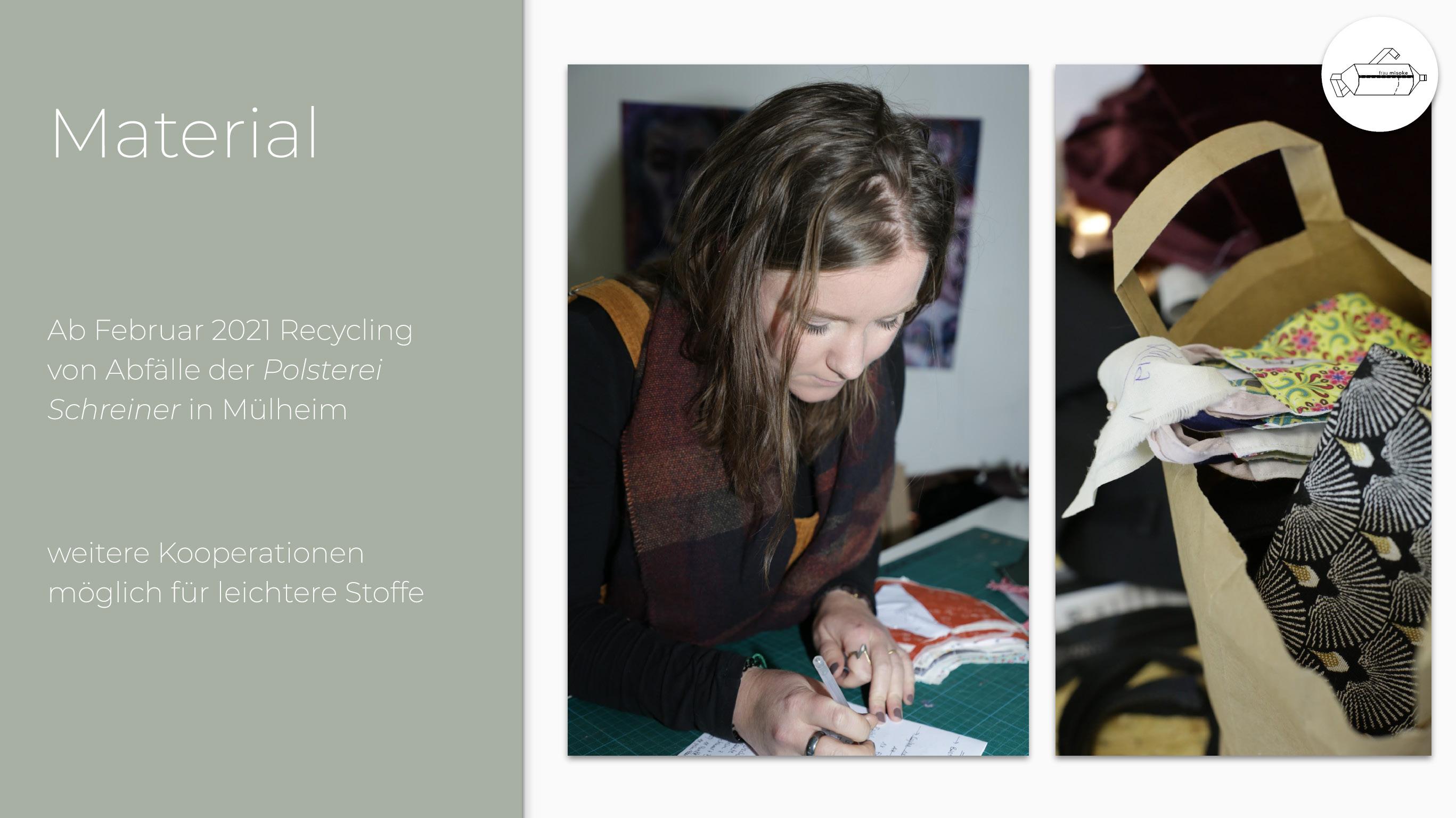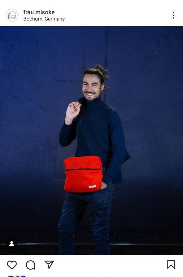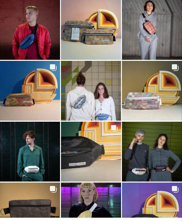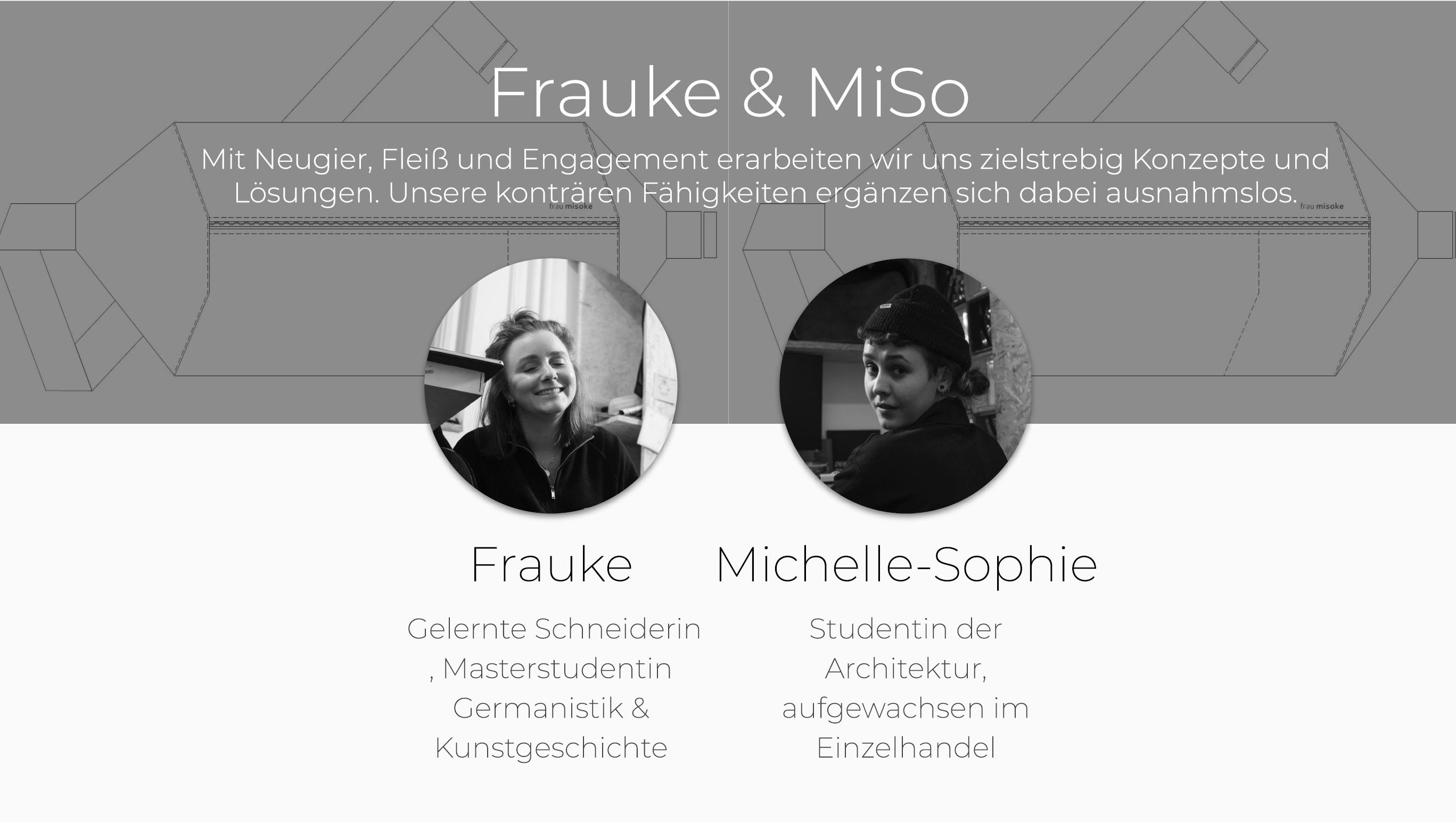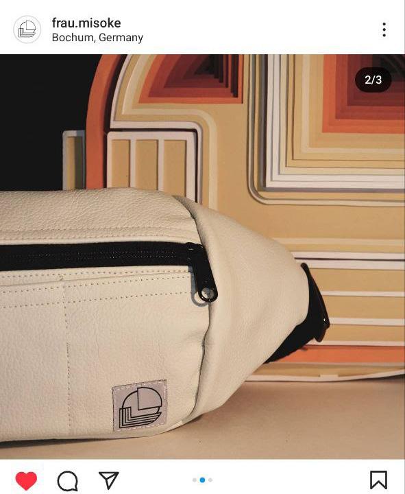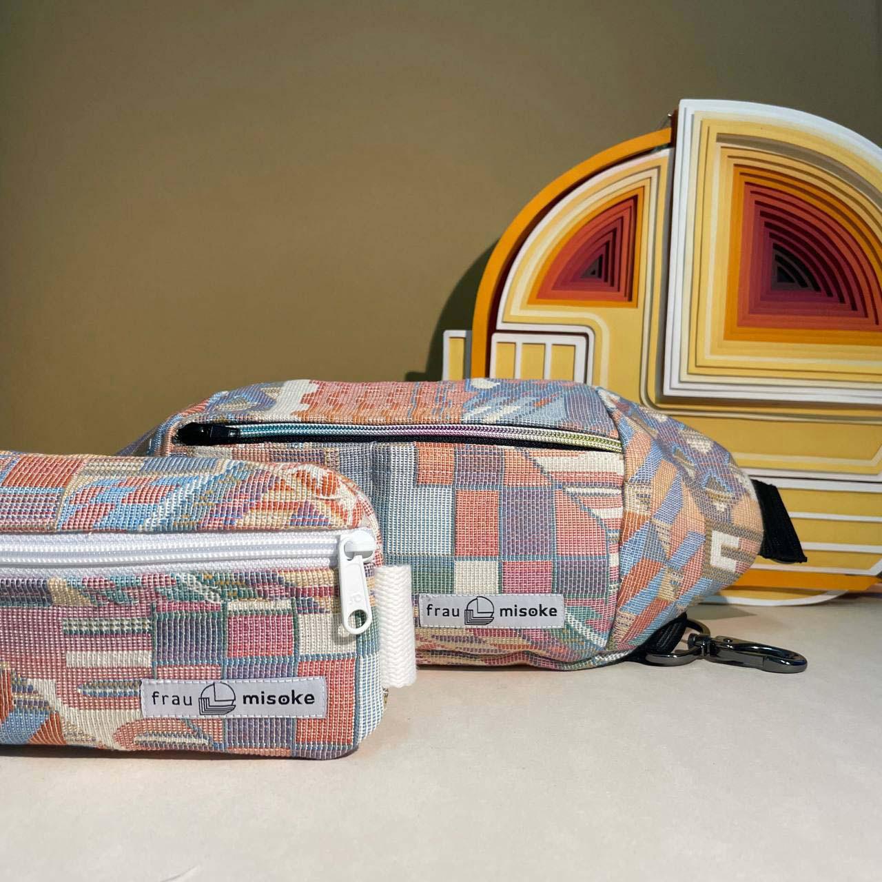 during our studies, frauke drewer and I developed the concept for “ frau misoke . we received the nrw start-up grant for the pitch deck. the idea was to design individual fanny packs locally, using recycled upholstery fabrics. we integrated well-known artists for patterns, logo and photoshoots into a holistic approach.