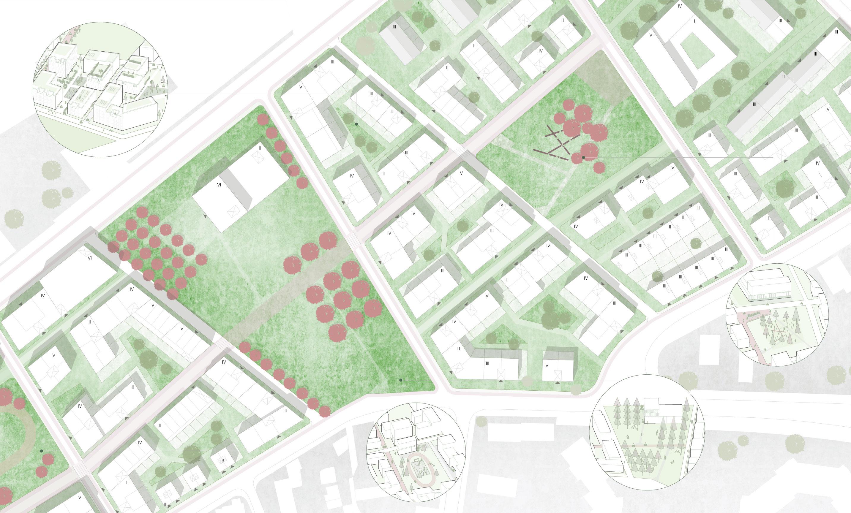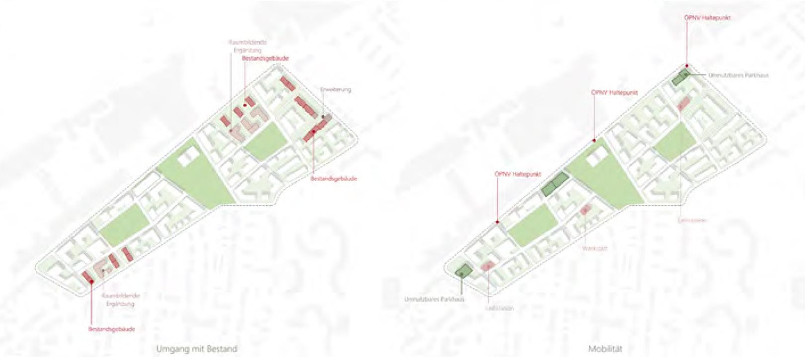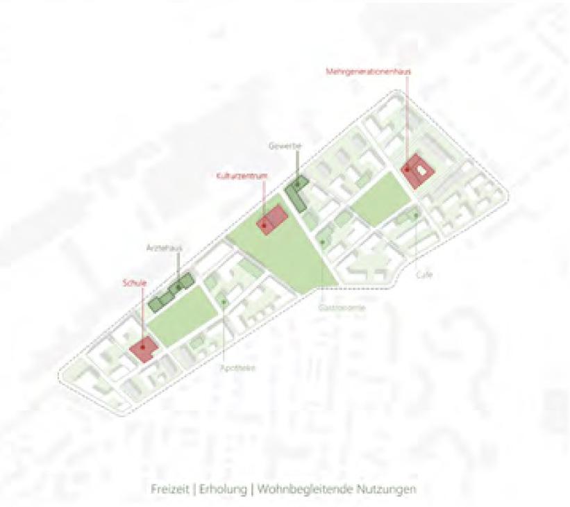 the design is based on the question of how existing urban structures can be used to exploit potential for future-oriented neighborhood development in the area of housing construction and open space networking. here, current issues of sustainability (social, ecological and economic) are combined by linking the need for socially mixed living space to the conditions of a green-connected neighborhood and developing a unity from this. we see the city as a combination of spheres of activity that consist of high-quality living and working space and, in their interplay, offer a home worth living in for everyone. at the heart of this is a combination of dense living space, surrounded by public and private open space and bound by a long-term functional and ecologically valuable development concept.