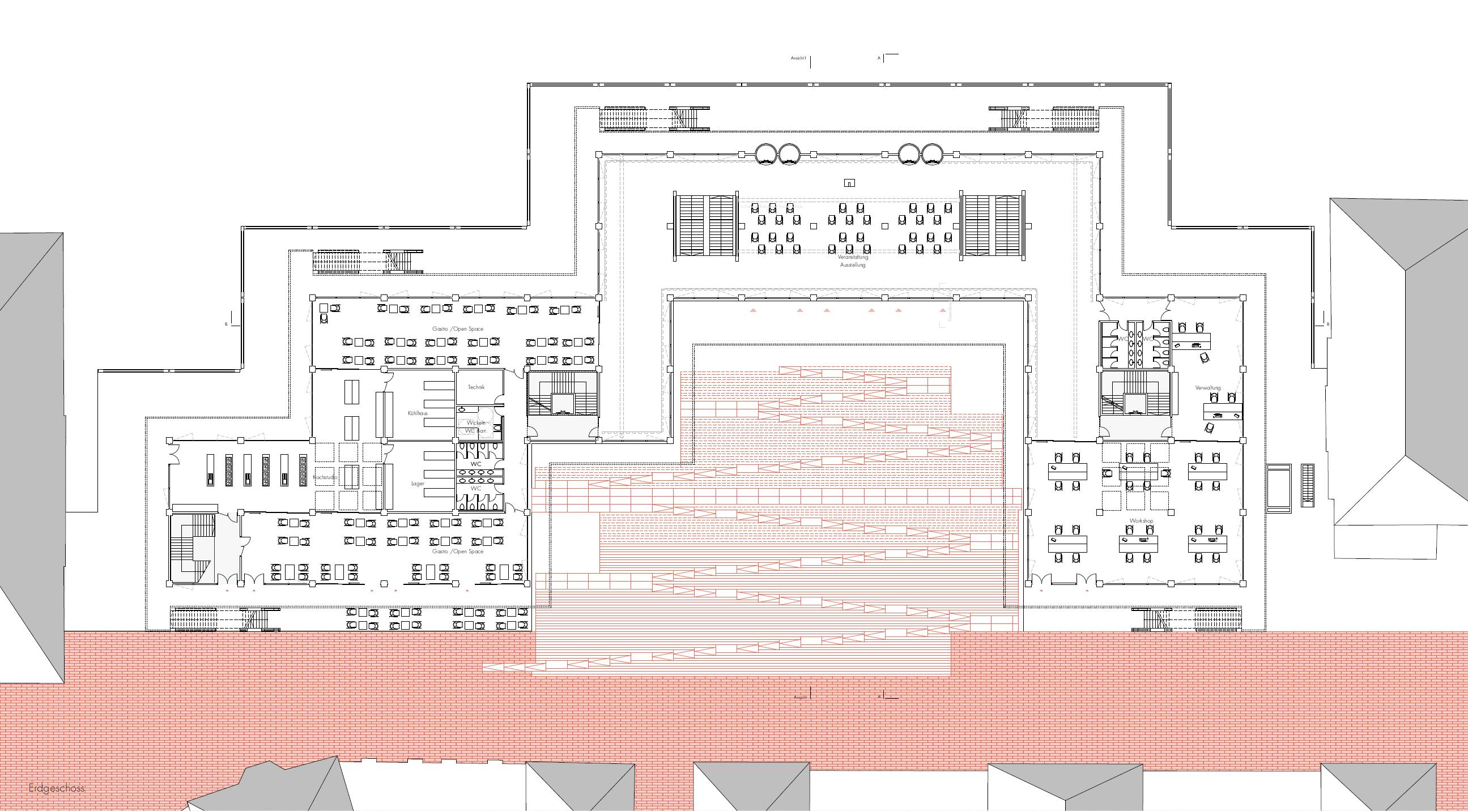bochum’s new archive building creates space and thus expands the city center. the slightly elevated platform with a view of the archive invites you to linger and at the same time connects the town hall park and the music school to the city center. the archiev in the underground adapts ideally to the static conditions and avoids the problem of load transfer. the cubes placed on top allow ideal visual relationships and flowing circulation. the two main staircases made of glass blocks bring the elements into a relationship, uniting the complex into one building.