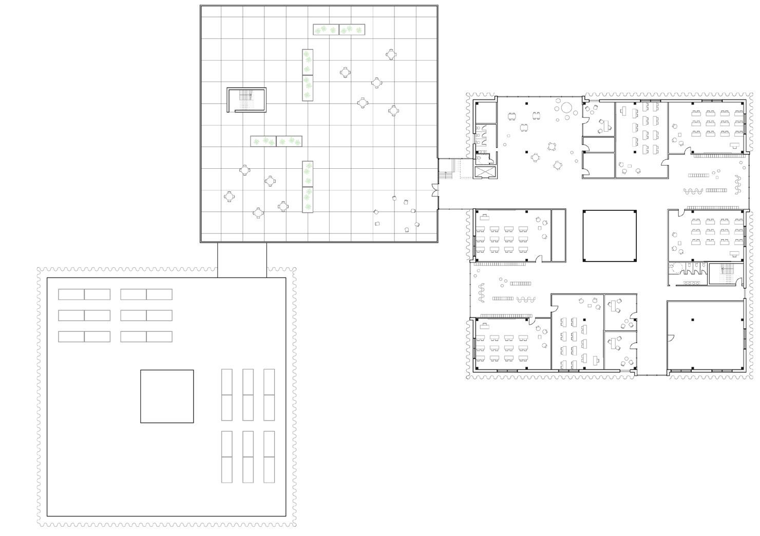 Les deux volumes distincts sont connectés entre eux par une passerelle comprenant un café. C’est donc un espace qui agit donc à la fois de transition et d’un point de rencontre et d’échange.