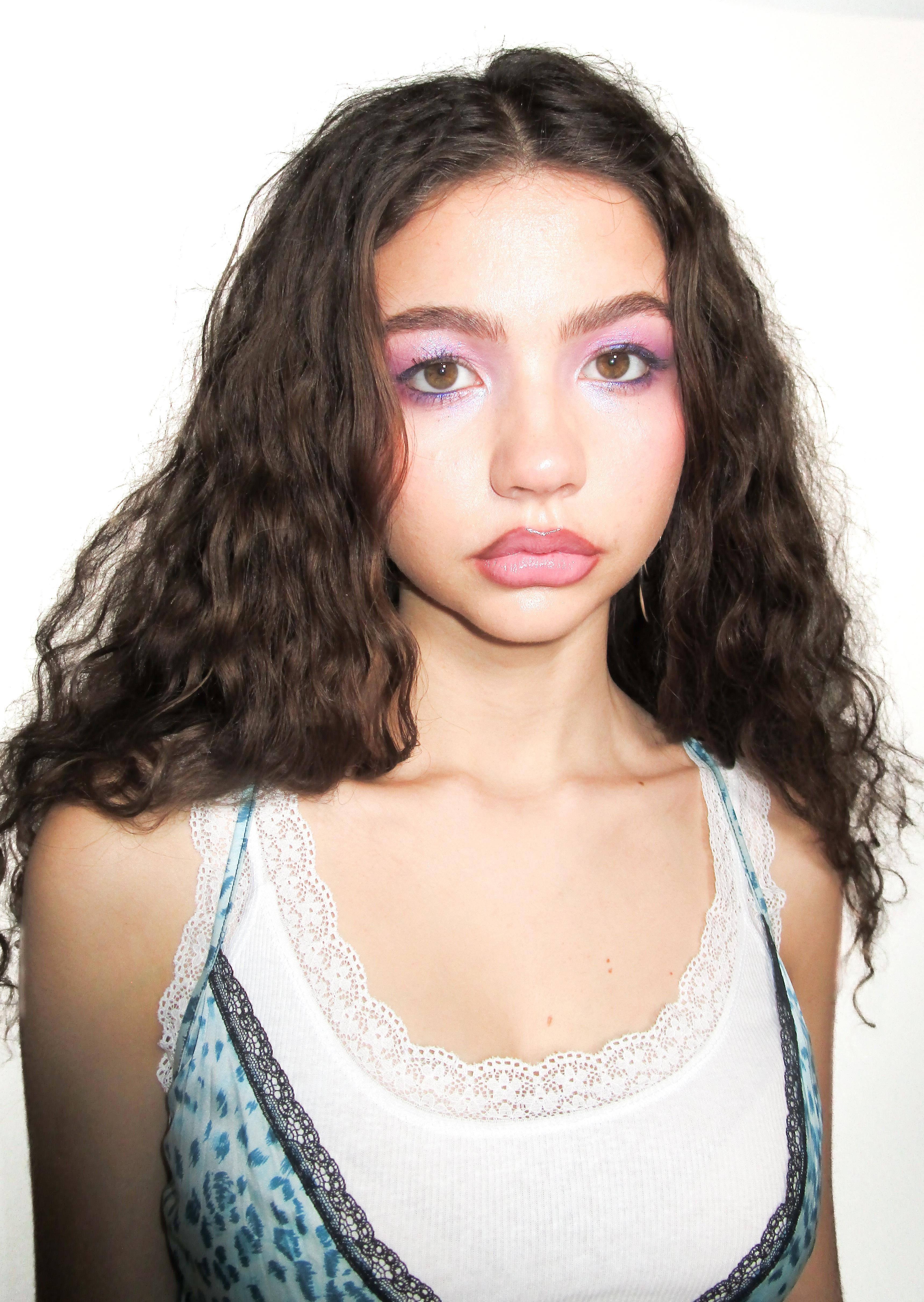 leah wears a colourful and youthful makeup look which incorporates that familiar y2k aesthetic we recall from movies growing up in the early 2000s.