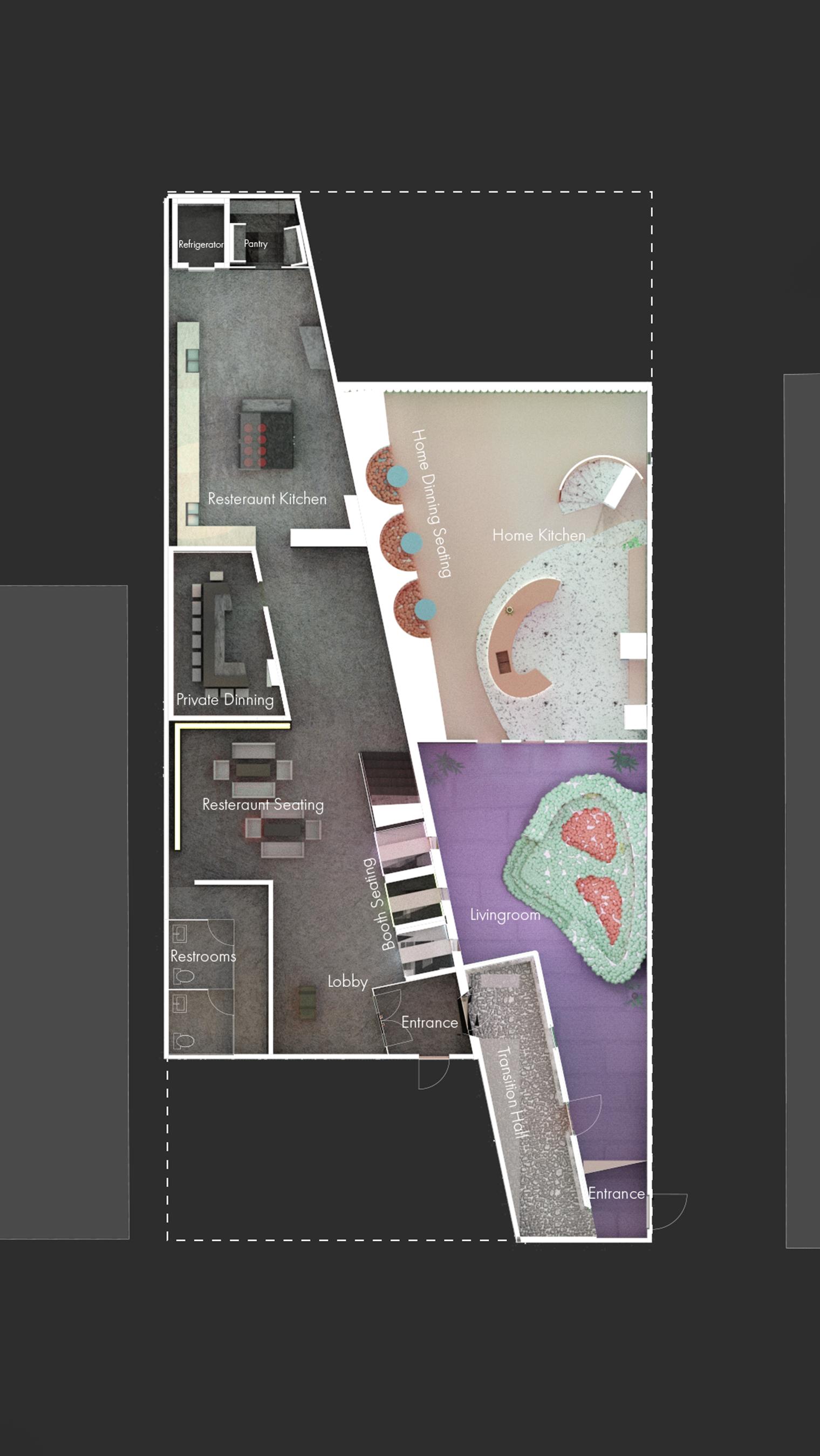 The project concept is to invite three chefs from different cultures around the globe to travel to Lincoln for a one-month residency in which they live together, learn from each other, and serve a collaborative meal each night for twenty guests. For many eager Lincoln diners, such an experience is a welcome antidote to the social and cultural isolation experienced throughout the COVID-19 pandemic. My projects goal is to reimagine the activities of cooking and eating through poetic and playful manipulations of architectural materials and details. The main conceptual driver behind this structure is the seperation between living and work spaces. For this I referenced the Chinese concept of Yin and Yang which is defined as two complimentary forces that exist as inseperable opposites. These forces make up all aspects of our lives. Within the structure there are two distinctive parts: one is the restaurant and the other is the chef’s personal living space. The materiality, form, and atmosphere of each side is distinctivly different but compliments one another.