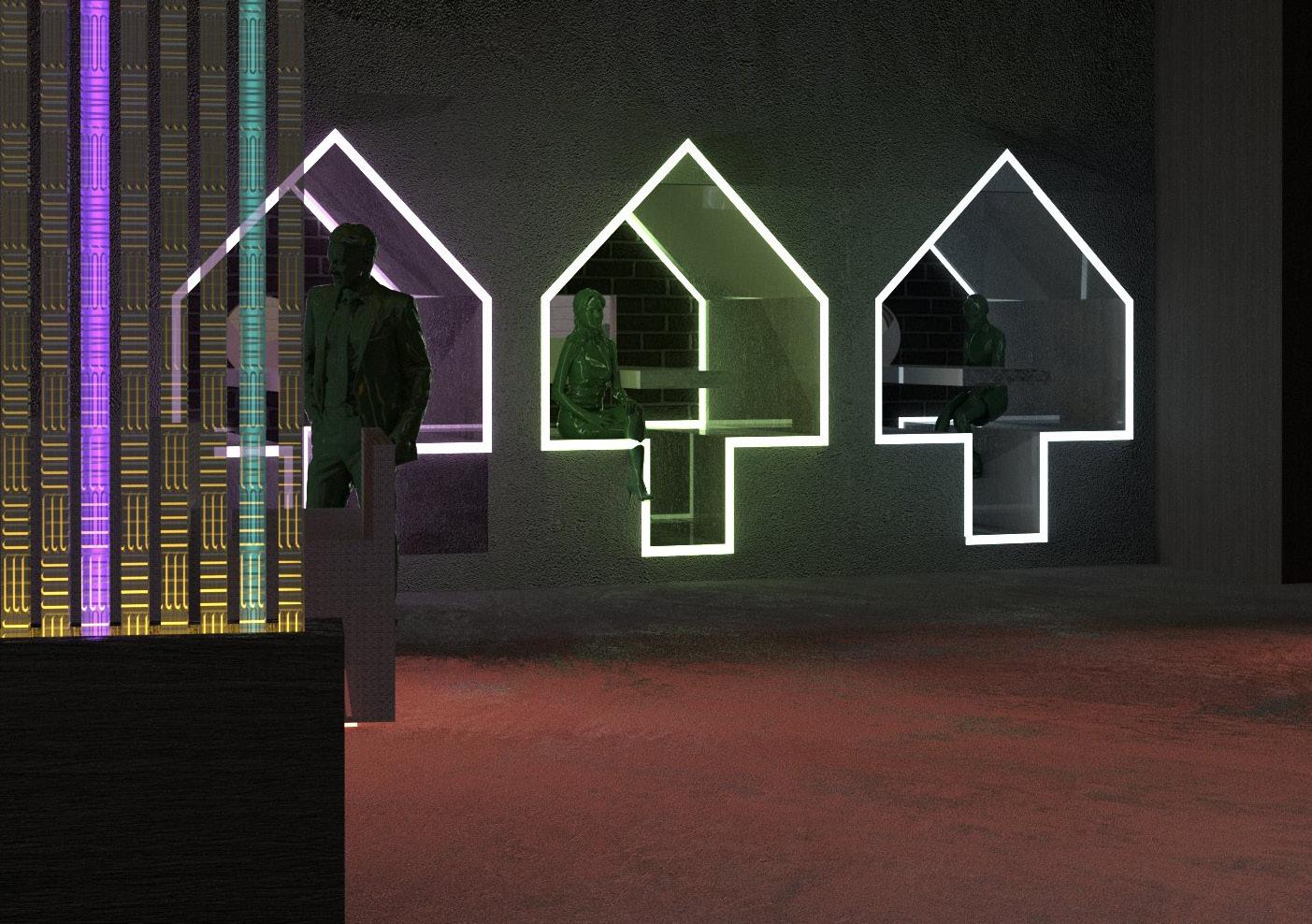 One of these points of bleed being a large glass opening on the resteraunt stairwell that looks into the living side’s kitchen. This allows restaurant customers to feel a connection to the chefs preparing their food and might even give an insight to some new recipes or ideas they are creating. This metaphorical “bleed” continues to the other side of the wall on the stairwell with use of a white, reflective brick. This allows the view from the chef’s side to be uninterupted as well as places an emphasis on this being a point of crossover between the sides. The restaurant side also contains artificial lighting and color that helps guide customers throughout the space. This as well helps to inform everyone what parts of the building are currently being in use based of what lights are on.
