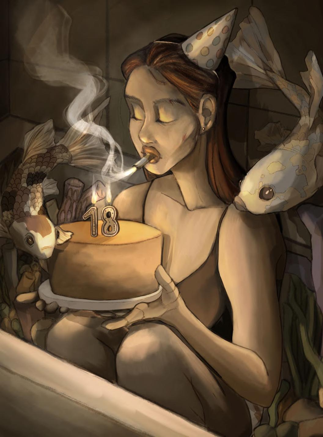 But the only place conquered by the realm of our touch was the flat, which we had grown accustomed to occupying with indifference. Each night, as the angels would carry the sun off to foreign lands and the moon would take its place, illuminating us in constant shadow, my lover would smoke her final cigarette, with a great cloud and the dust exhaled from the depths of her heart. It would create a strong sandstorm that would obscure her face but never her beauty, and with that, we would skip hand in hand each night into the solemnity of a winter’s love and the peace of death.