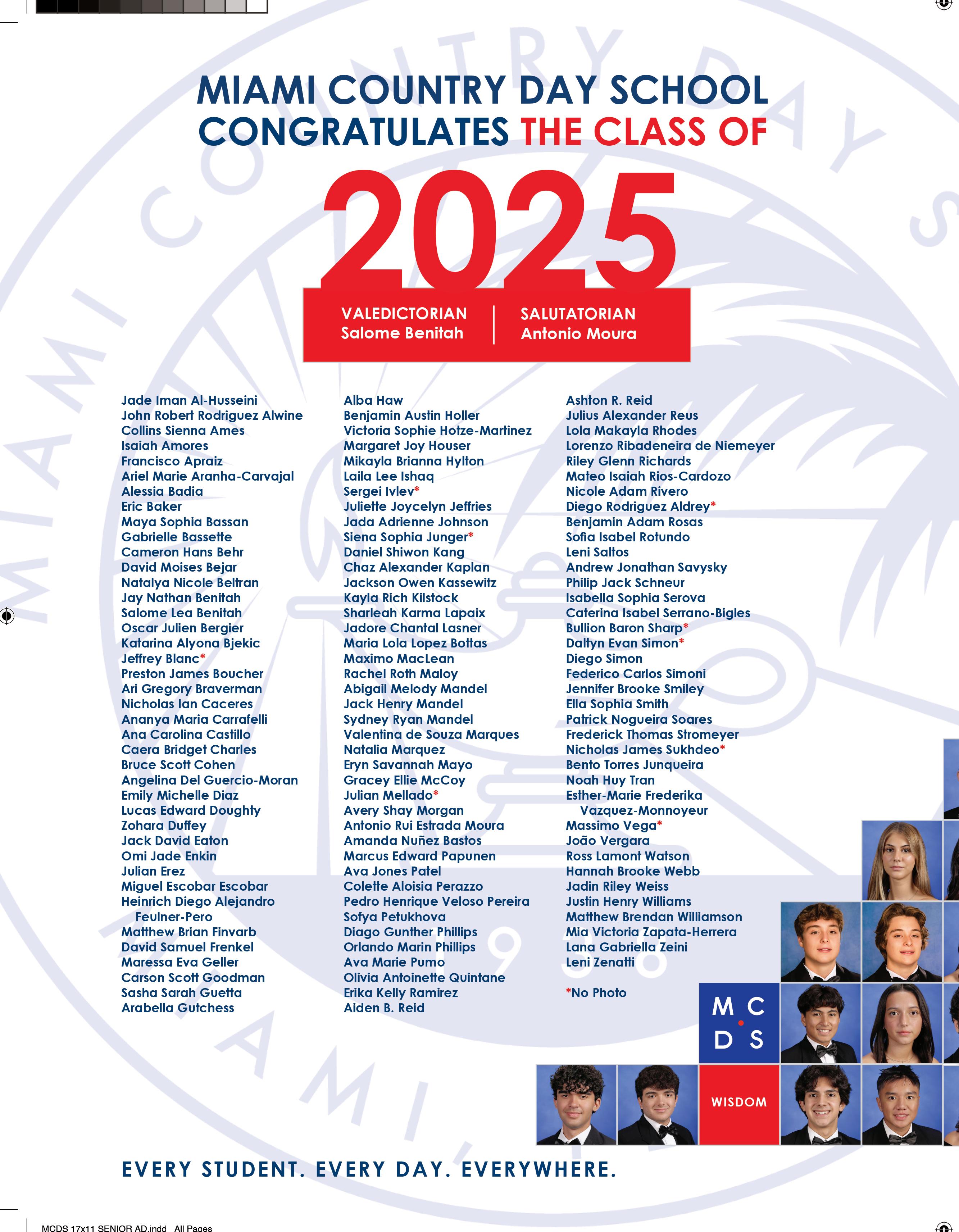 Congratulations, Class of 2025! It’s with great excitement that I now address you as alumni of Miami Country Day School. I want to welcome each of you to the Alumni Association! Best of luck embarking on this next chapter in your life, and we look forward to having you back on campus and engaged with MCDS as alumni.