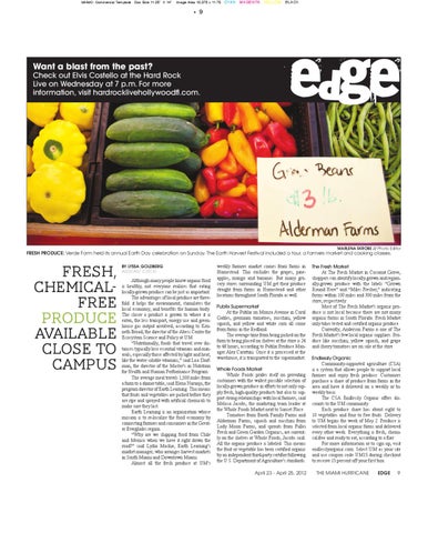 weekly farmers market comes from farms in Homestead. This excludes the grapes, pineapples, mango and bananas. But many grocery stores surrounding UM get their produce straight from farms in Homestead and other locations throughout South Florida as well. Publix Supermarket At the Publix on Monza Avenue in Coral Gables, premium tomatoes, zucchini, yellow squash, and yellow and white corn all come from farms in the Redland. The average time from being picked on the farm to being placed on shelves at the store is 24 to 48 hours, according to Publix Produce Manager Alex Carattini. Once it is processed at the warehouse, it is transported to the supermarket. Whole Foods Market Whole Foods prides itself on providing customers with the widest possible selection of locally-grown produce in efforts to not only supply fresh, high-quality products but also to support strong relationships with local farmers, said Melissa Jacobs, the marketing team leader at the Whole Foods Market next to Sunset Place. Tomatoes from Borek Family Farms and Alderman Farms, squash and zucchini from Lady Moon Farms, and sprouts from Fullei Fresh and Green Garden Organics, are currently on the shelves at Whole Foods, Jacobs said. All the organic produce is labeled. This means the fruit or vegetable has been certified organic by an independent third-party certifier following the U.S. Department of Agriculture ’s standards. April 23 - April 25, 2012