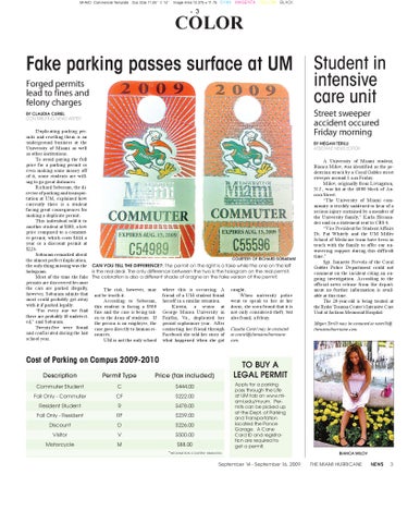 Duplicating parking permits and reselling them is an underground business at the University of Miami as well as other institutions. To avoid paying the full price for a parking permit or even making some money off of it, some students are willing to go great distances. Richard Soboram, the director of parking and transportation at UM, explained how currently there is a student facing great consequences for making a duplicate permit. This individual sold it to another student at $180, a low price compared to a commuter permit, which costs $444 a year or a discount permit at $226. Sobaram remarked about COURTESY OF RICHARD SOBARAM the almost perfect duplication, the only thing missing was the CAN YOU TELL THE DIFFERENCE?: The permit on the right is a fake while the one on the left is the real deal. The only difference between the two is the hologram on the real permit. hologram. Most of the time the fake The coloration is also a different shade of oragne on the fake version of the permit. permits are discovered because the cars are parked illegally, The risk, however, may where this is occurring. A caught. however, Sobaram admits that not be worth it. friend of a UM student found When university police most could probably get away According to Soboram, herself in a similar situation. went to speak to her at her with it if parked legally. this student is facing a $500 Kirstin, a senior at dorm, she soon found that it is “For every one we find fine and the case is being tak- George Mason University in not only considered theft, but there are probably 10 undetect- en to the dean of students. If Fairfax, Va., duplicated her also fraud, a felony. ed,” said Sobaram. the person is an employee, the permit sophomore year. After Twenty-five were found case goes directly to human re- contacting her friend through Claudia Curiel may be contacted and confiscated during the last sources. Facebook she told her story of at ccuriel@themiamihurricane. school year. UM is not the only school what happened when she got com.