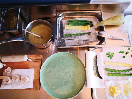 Sauce : Faites un fumet de poisson avec les arêtes, l’échalote, le vin blanc et l’eau. Après 20 min, ajoutez les tiges de basilic, coriandre, galanga et poivre vert et faites cuire encore 20 min à couvert. Filtrez avant de réduire avec le jus de citron jusqu’à 1 dl. Incorporez la fécule, puis montez à l’huile d’olive jusqu’à obtenir une sauce nappante et bien brillante.