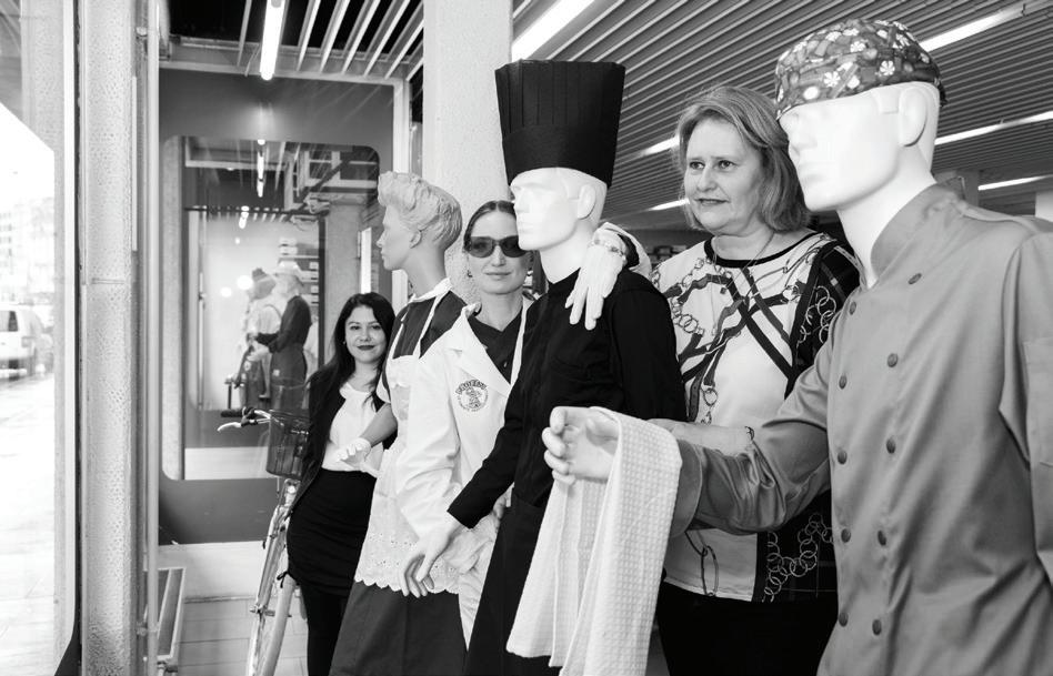 Située dans le quartier de Plainpalais au centre-ville de Genève, Profess dispose d’une grande arcade et fournit les tenues à de multiples métiers : médecin, infirmi(er)ère, personnel de maison, chauffeur de limousine… ainsi qu’aux entreprises du bâtiment, de l’hôtellerie et de la restauration. « Nos clients demandent des coupes plus modernes, plus jeunes et prèsducorps», décrit Alexandra Herter concédant que « beaucoupdeprofessions restent dans des teintes classiques. » En