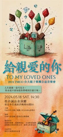 音樂,是家庭間情感的橋樑,是記憶中 不滅的火焰。在TMCO台大親子樂團 的舞台上,我們將這份情感化為旋律, 讓每一個音符都承載著家庭的溫暖與 愛。5月18日,我們誠摯邀請您參加「 給我親愛的」音樂會,一同體驗音樂如 何緊密連結我們的生活。