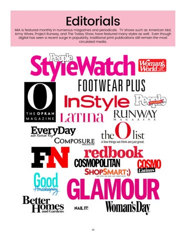 MIA is featured monthly in numerous magazines and periodicals. TV shows such as American Idol, Army Wives, Project Runway, and The Today Show, have featured many styles as well. Even though digital has seen a recent surge in popularity, traditional print publications still remain the most circulated media.