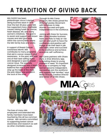 A TRADITION OF GIVING BACK MIA SHOES has been philanthropic since it started doing business back in 1976. Over the last 40 plus years MIA has supported many charitable causes raising funds for cancer, heart disease, MS, and many women’s initiatives. The goal is to assist and support well known causes and also give back within the communities where the MIA family lives and works. In support of Breast Cancer Awareness Month, MIA contributes to many programs that aid in cancer research and awareness. In the past, MIA took one of their best selling styles and designed a special breast cancer issue. The specially designed Amanada was a black ballerina flat with a pink fabric strip up the back of the shoe; the pink ribbon was printed in the sock of the shoe.