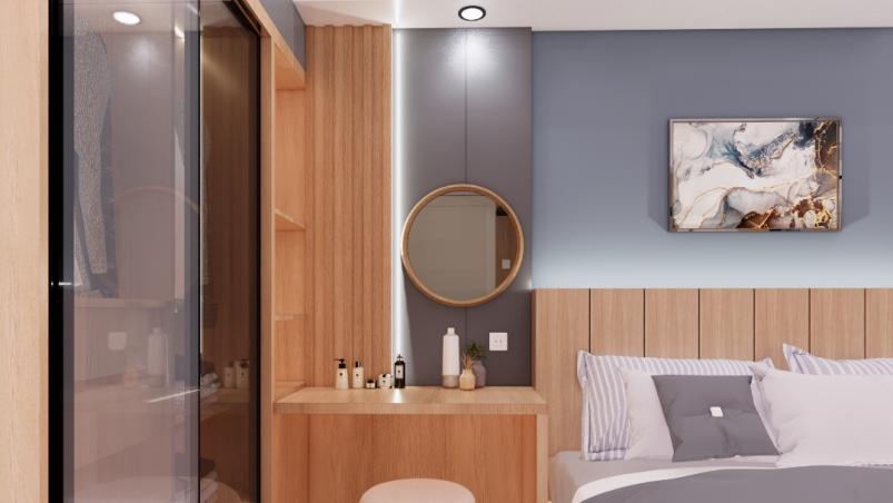 Bedroom with concept “Japandi Modern” are very popular for teenager. The Client requested all the walls of the room to be covered wtih ceramic tiles. He wants a simple looks with grey combination color.