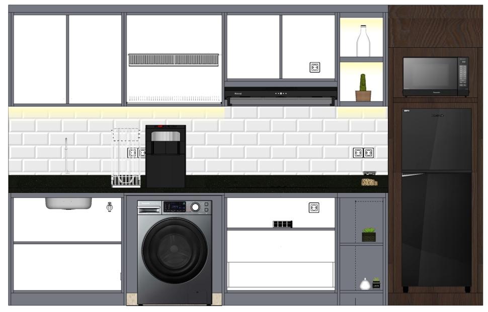 A combination of solid color and wood texture makes the kitchen area looks modern.