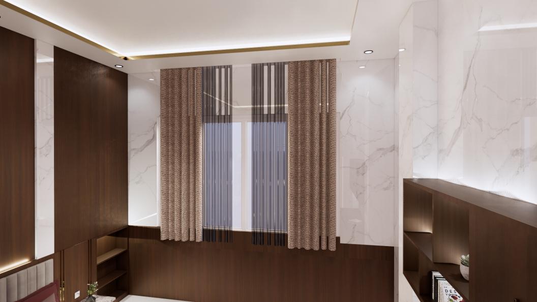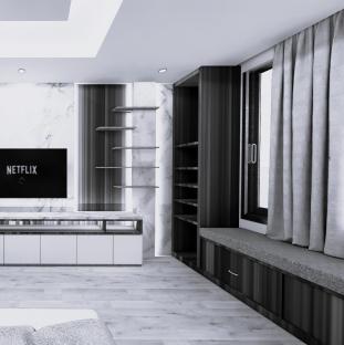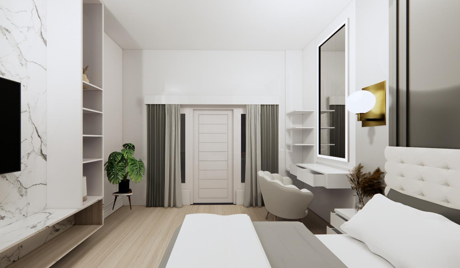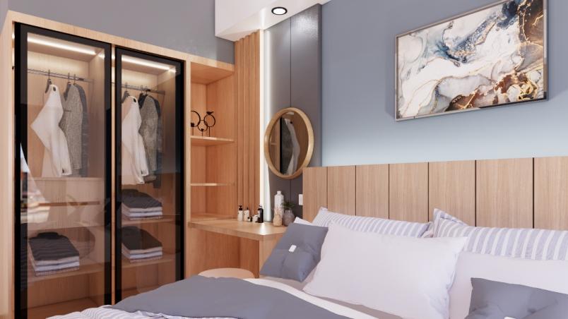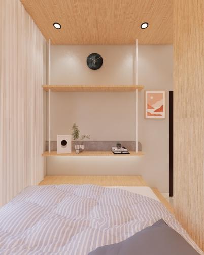 The client request for a room with a minimalist concept. Neutral colors tone using the Japandi Style by using wood material for some furniture area and flooring.