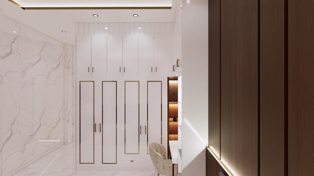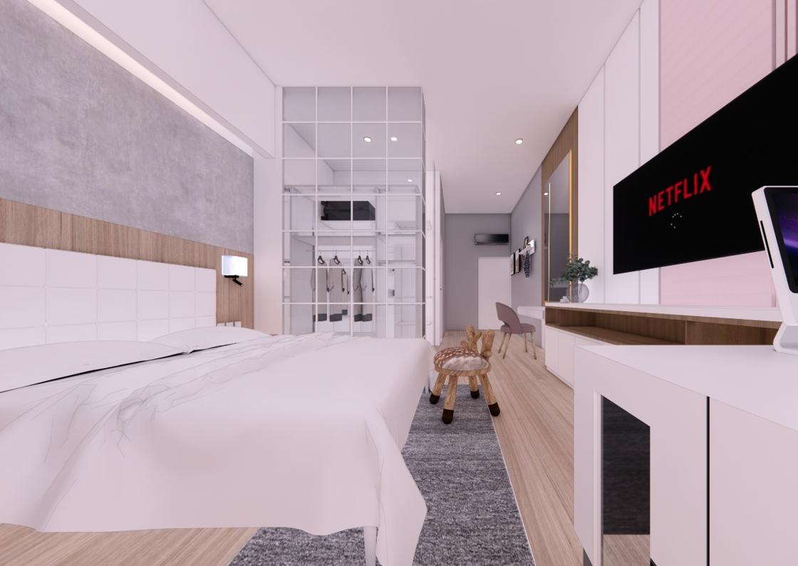 Open Space Walk-In Closet make the space looks wide and clean. Pink and white give a soft taste to every details from the spot. The bedroom feel cozy and light with warm lighting.
