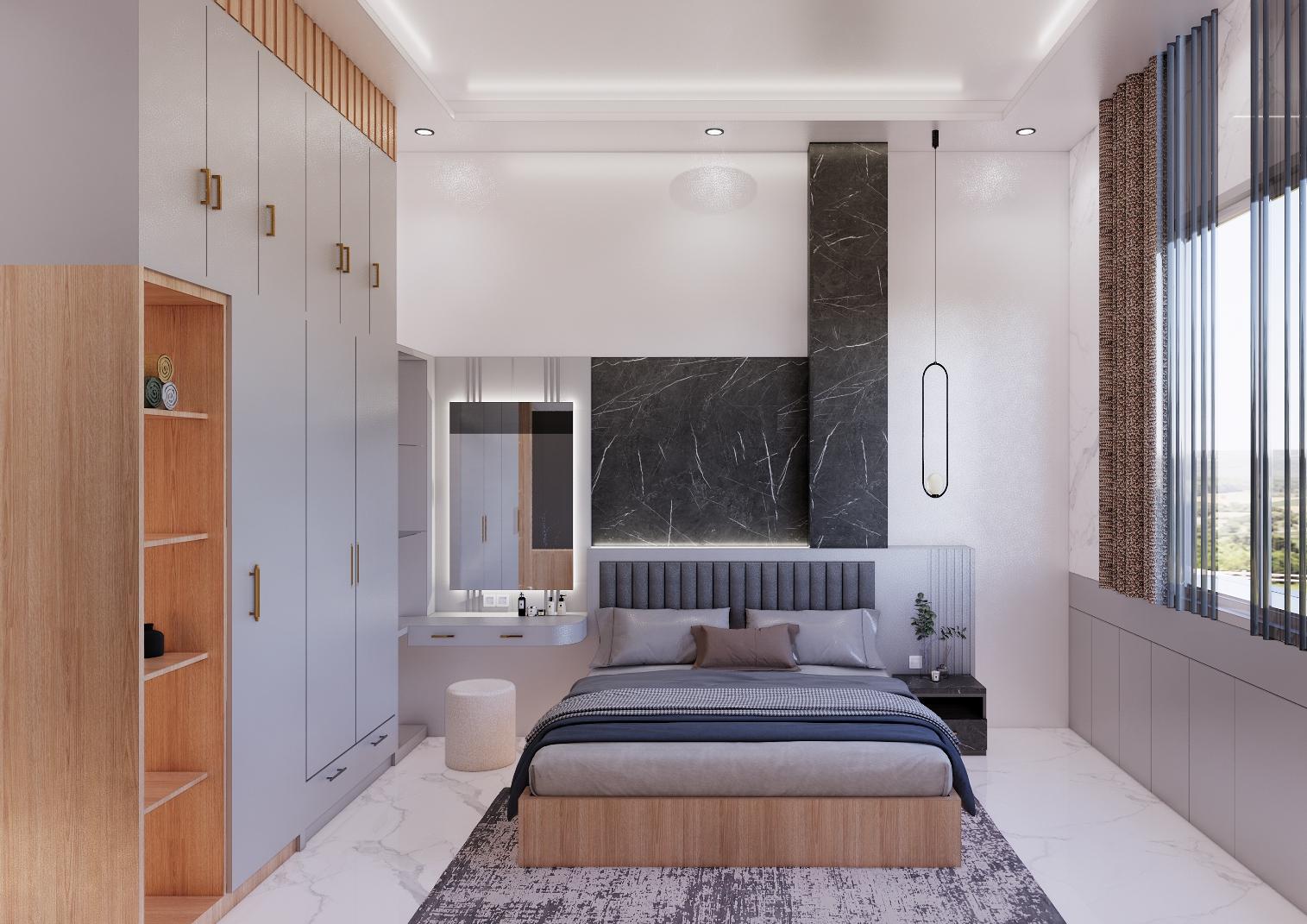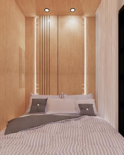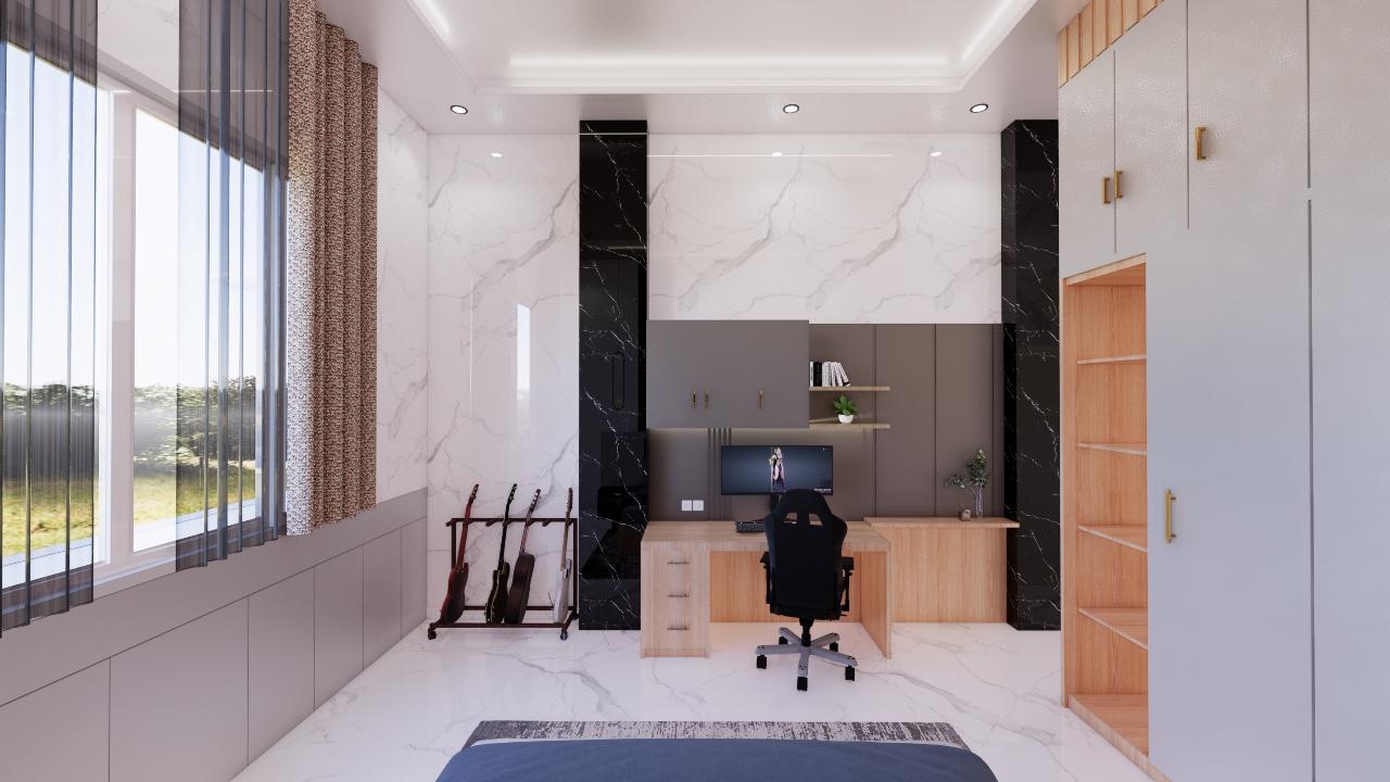 Bedroom with concept “Japandi Modern” are very popular for teenager. The Client requested all the walls of the room to be covered wtih ceramic tiles. He wants a simple looks with grey combination color.