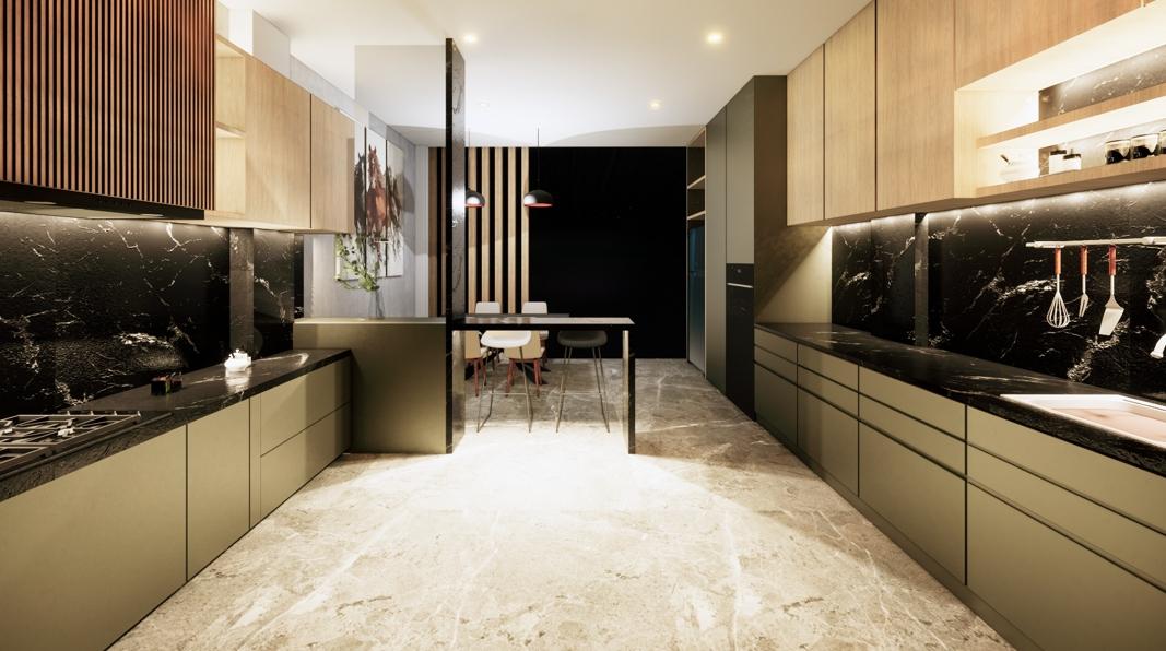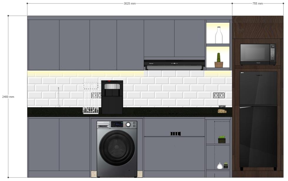 A combination of solid color and wood texture makes the kitchen area looks modern.