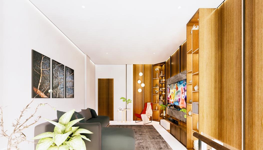 A Living room is using wood accent, bringing touch of detail into the warming and modern space. Display area to put up the decoration make the space more beautiful. The light wood color makes the room feel more spacious.