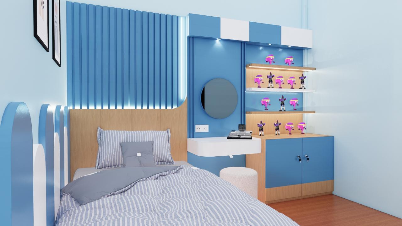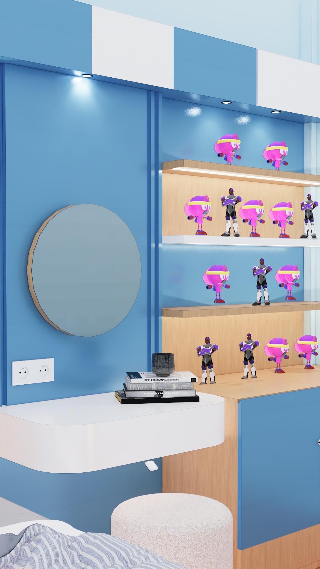 year old girl asked her parents to design her bedroom with blue and a combination of wood motifs. She asked to make a display