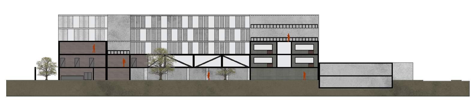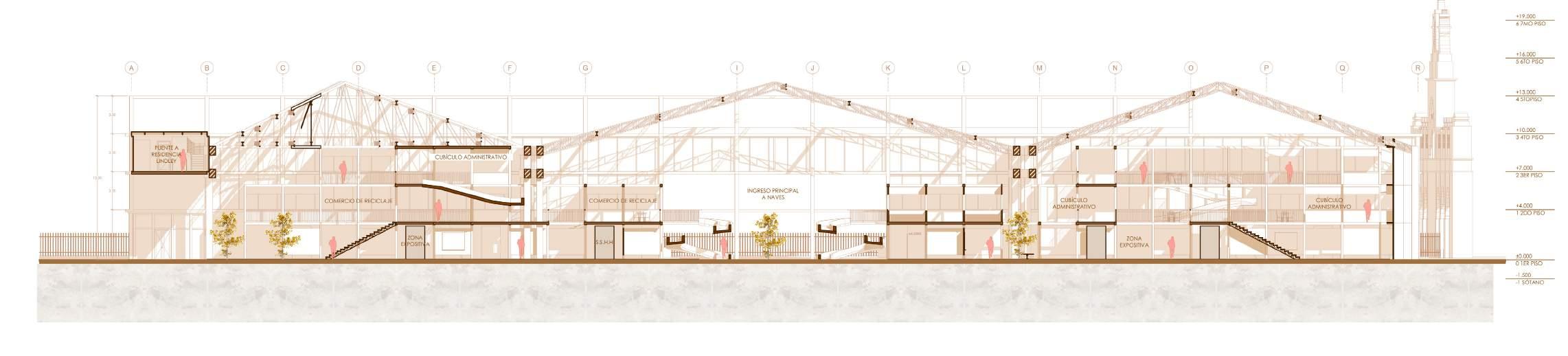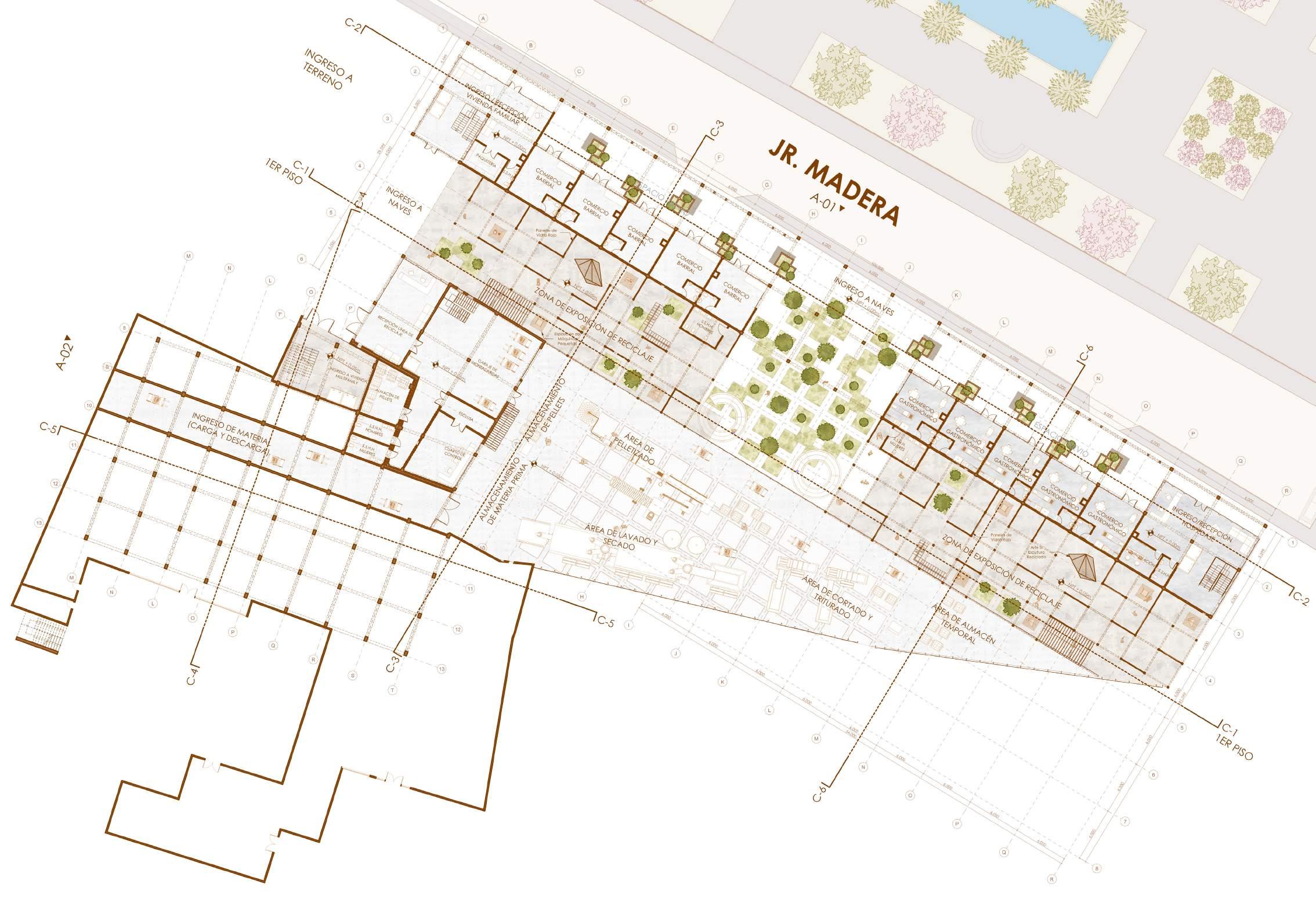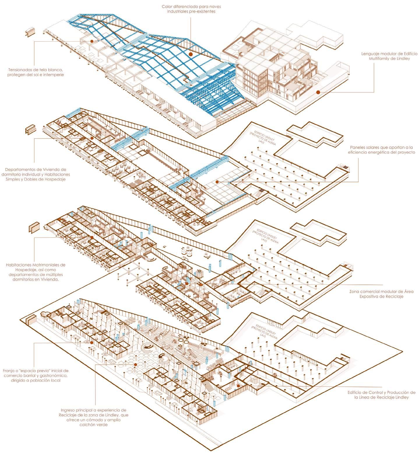 una aproximación al depurado de conceptos relacionados a la historia del Rímac, así como el largo contexto detrás de la ocupación de las fábricas Backus y Lindley en la manzana. la línea de reciclaje de Lindley funciona como un acto de tres partes, el cual comienza a partir de la fachada frente al Paseo de las Aguas. Una vez se cruzaestalíneadecomerciobarrialyresidencia,se ingresaalazonaexpositivadelalíneadereciclaje. este espacio presenta un fuerte lenguaje industrial que culmina en la última franja; es decir, la propia línea de máquinas recicladoras PET.