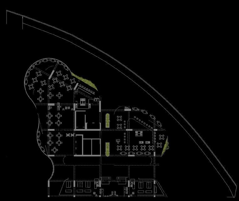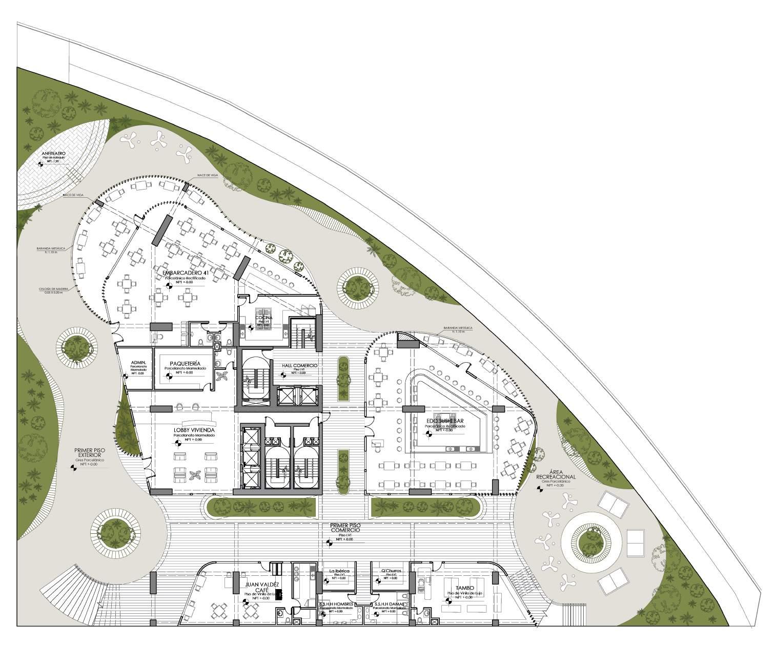 Las líneas son utilizadas para completar destajos, delimitar espacios y estructura. Los espacios pueden ser de naturaleza dinámica y estática. El espacio público debajo presenta áreas verdes, anfiteatros y espejos de agua.