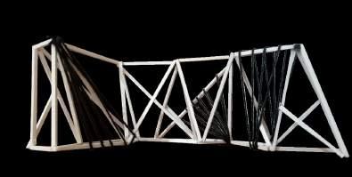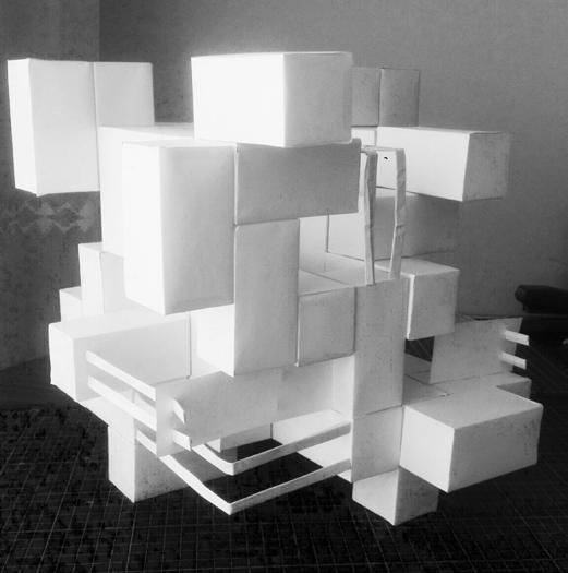 Volumen complejo formado por paralelepípedos de papel . Los planos añadidos ayudan a formar diversos espacios estáticos, y al mismo tiempo presentan una composición entre ellos. Las líneas actúan como delimitación, soporte y permiten que los planos tengan mayor alcance.