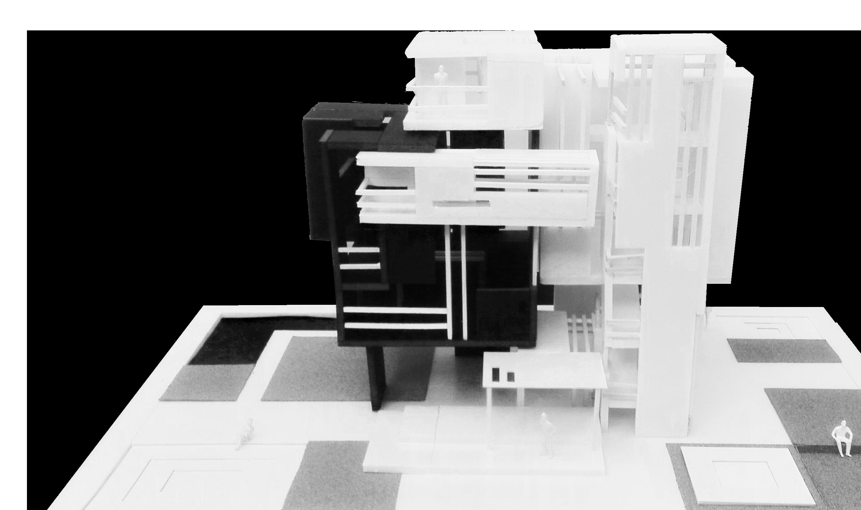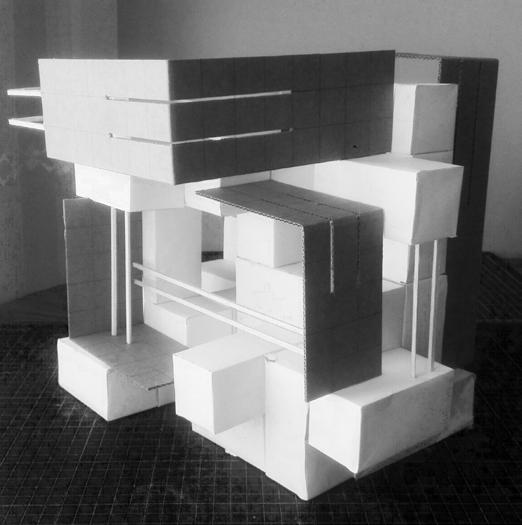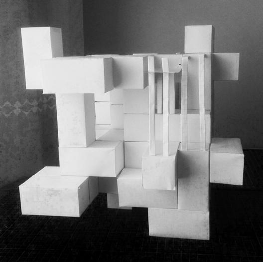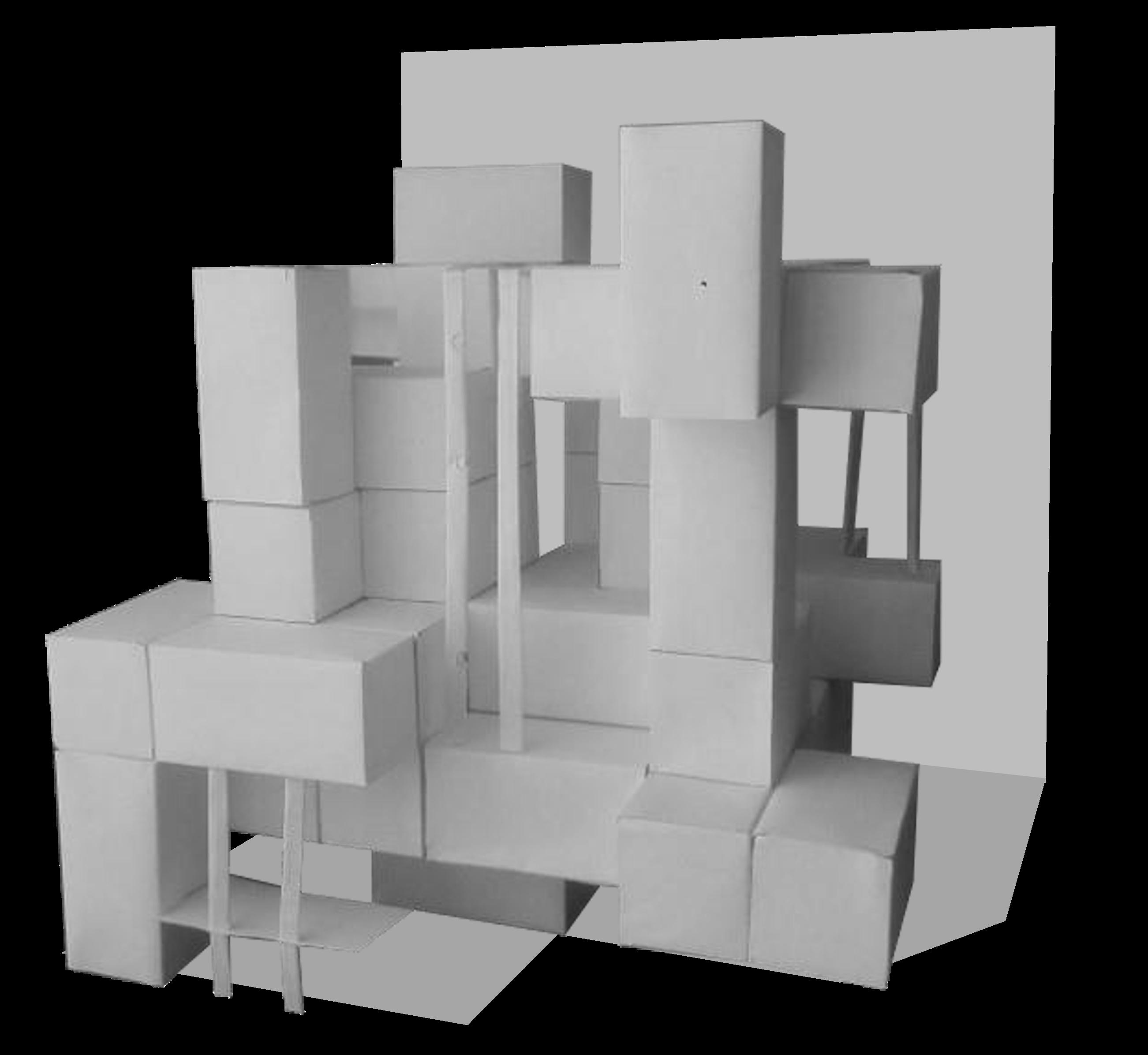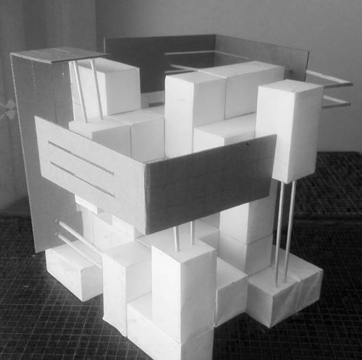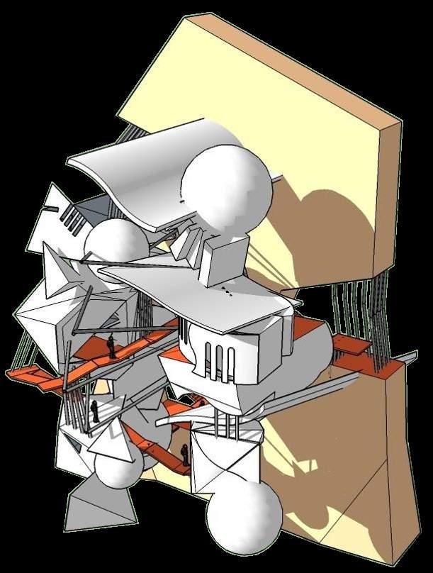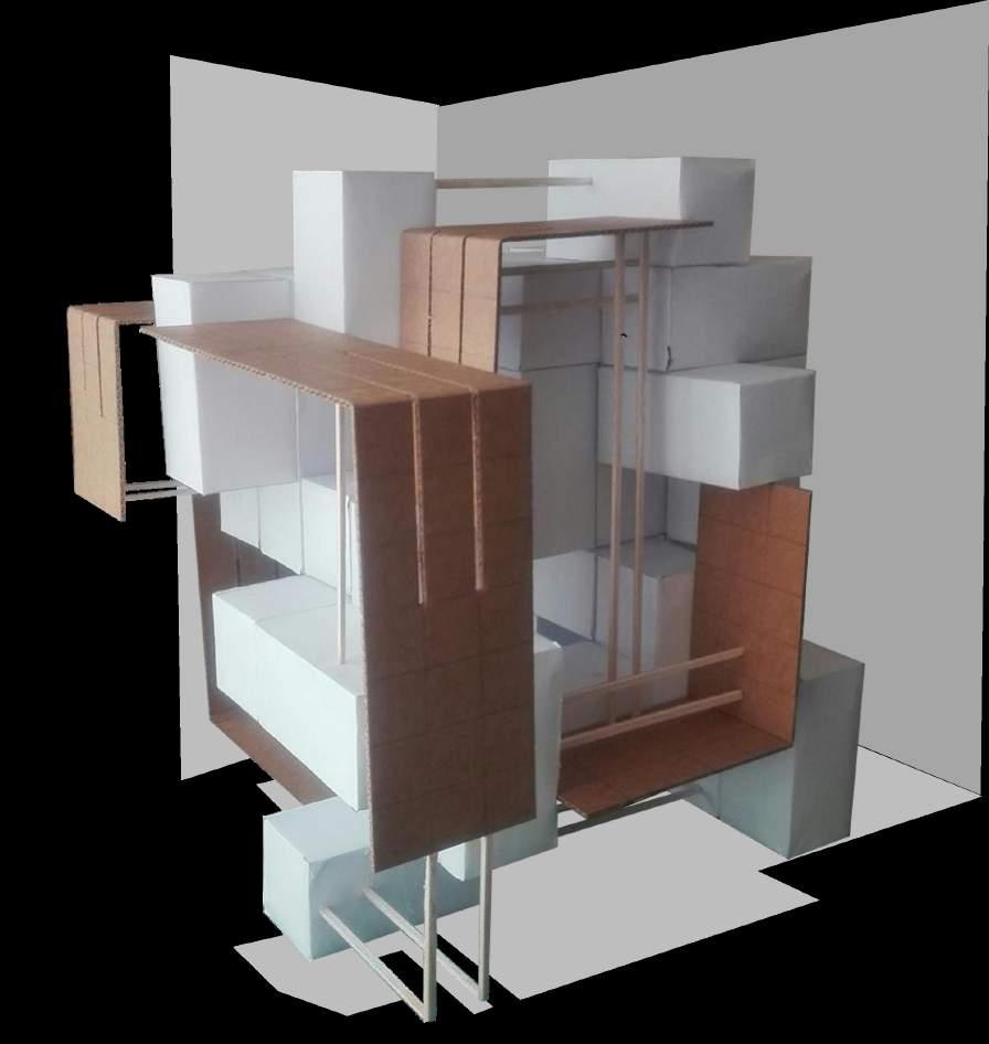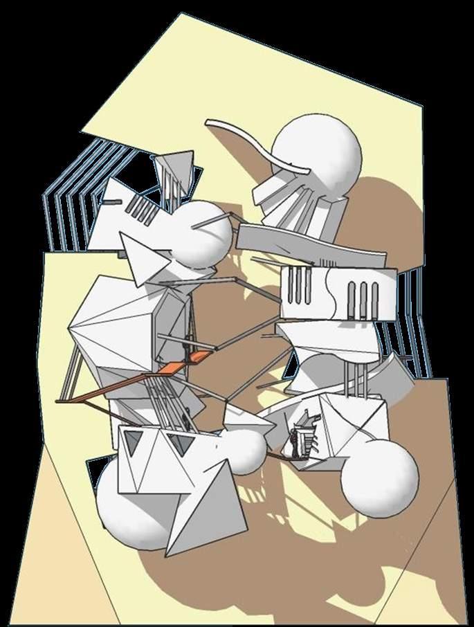se elabora una extrusión a partir de un collage que representa un valor (dualidad) . Se genera un vacío o silencio central y un recorrido preliminar entre los volúmenes. Se agrega terreno.