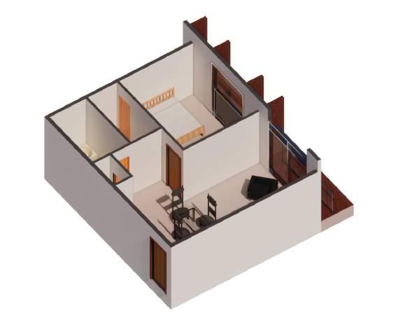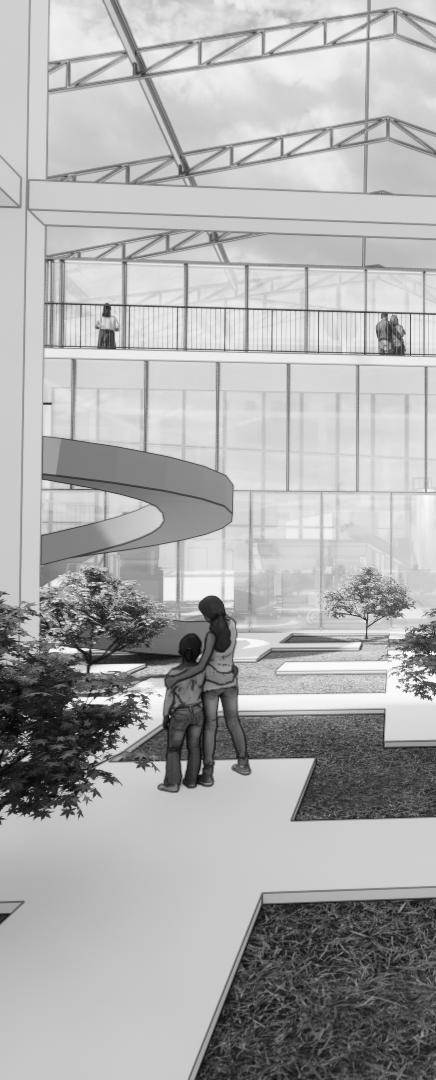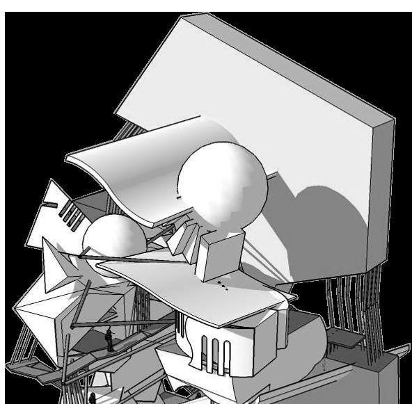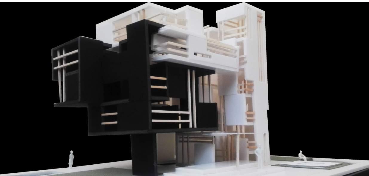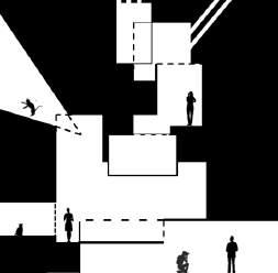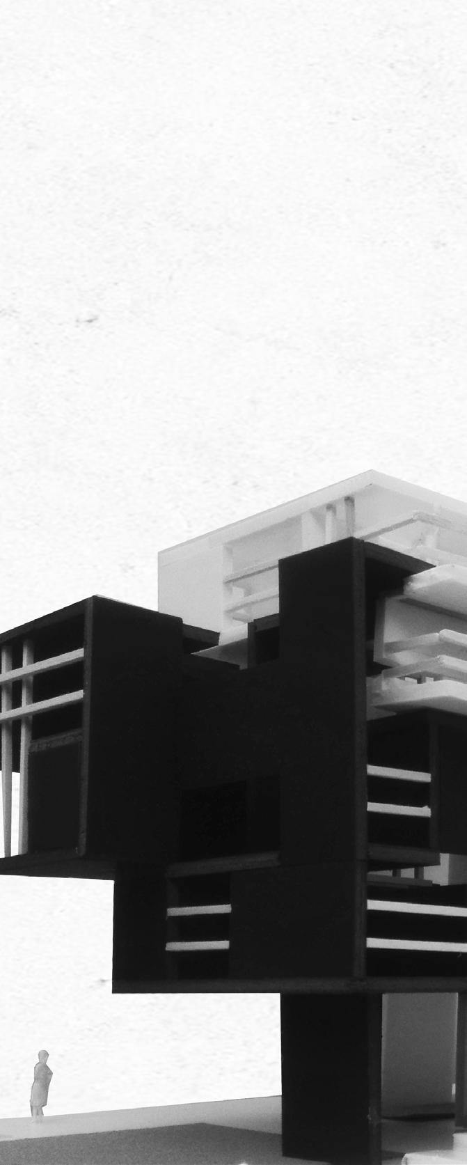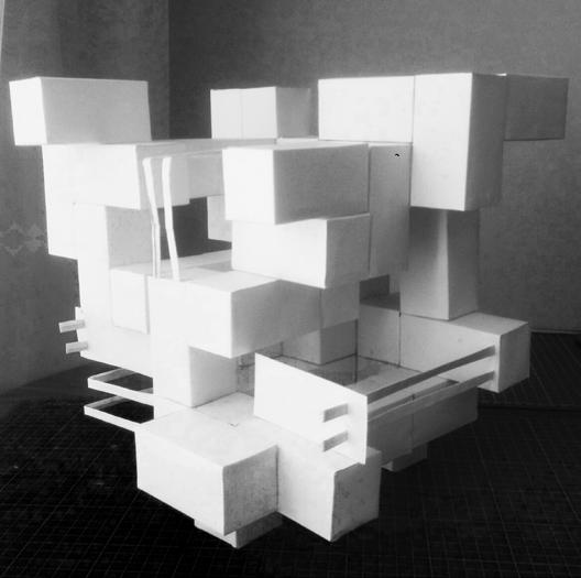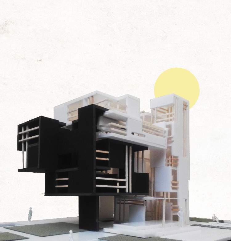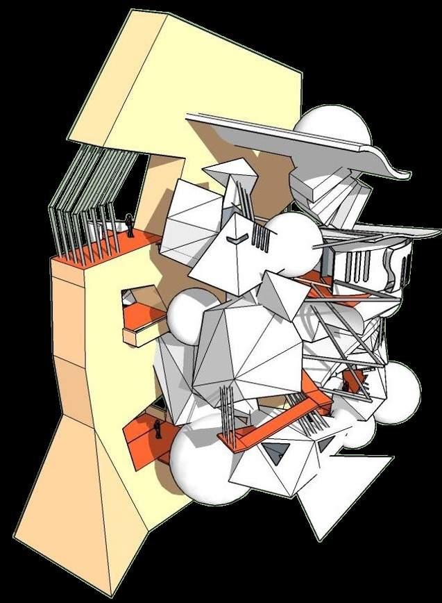 se elabora una extrusión a partir de un collage que representa un valor (dualidad) . Se genera un vacío o silencio central y un recorrido preliminar entre los volúmenes. Se agrega terreno.