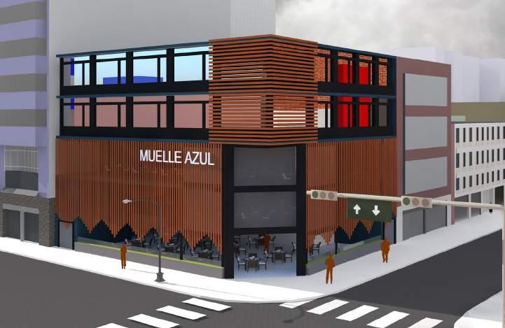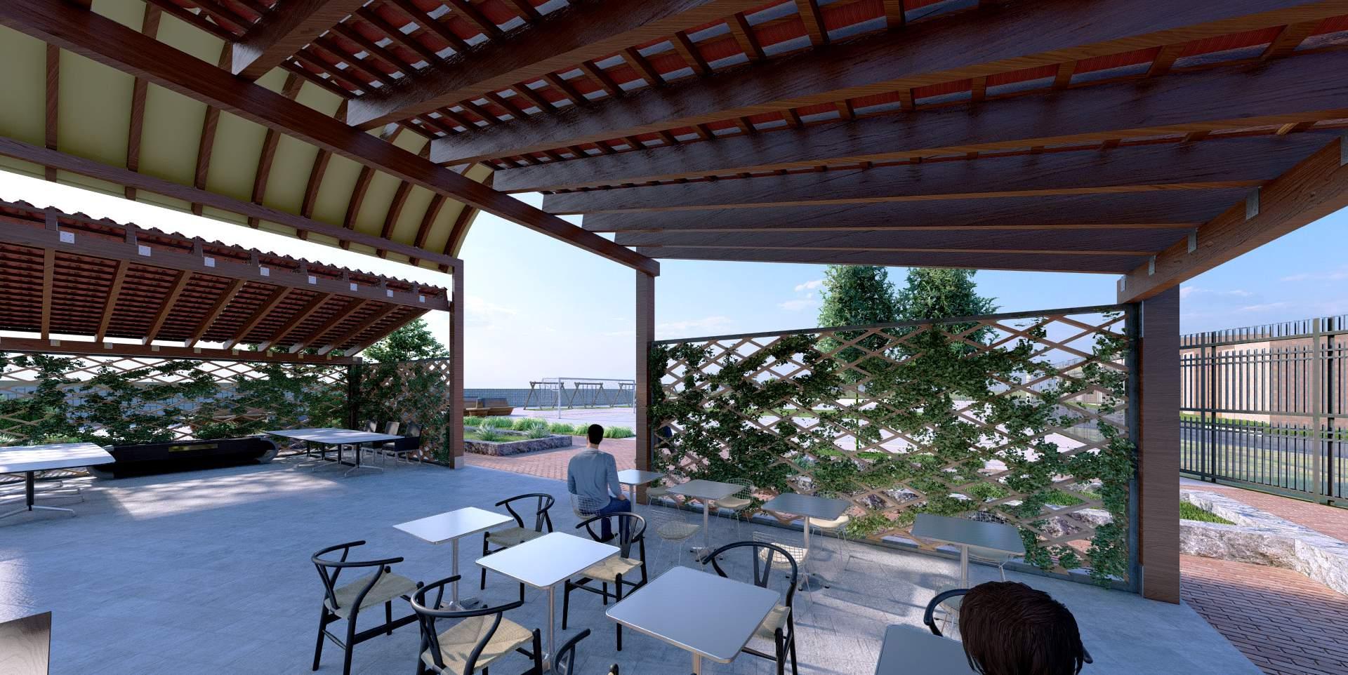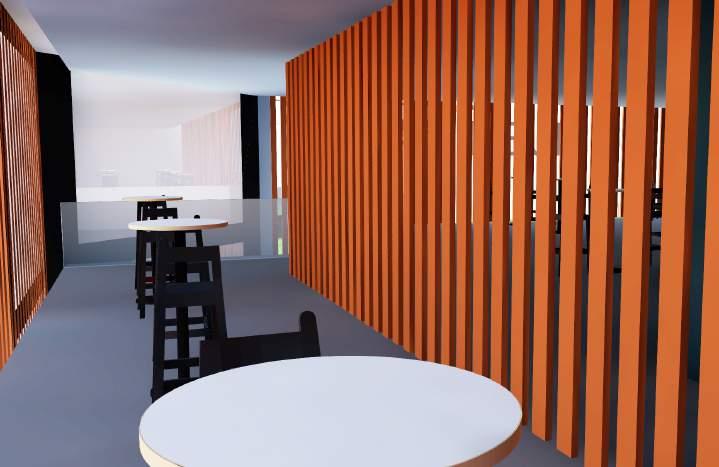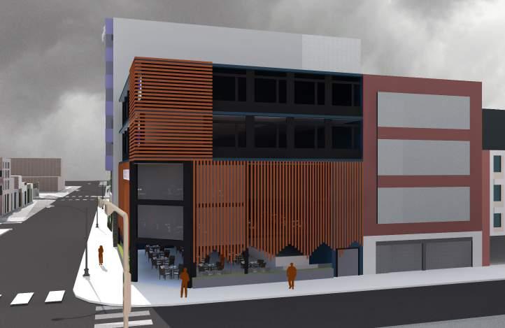 en este resultado, se implementaron celosías de madera en todo el alrededor de la fachada del restaurante, para así ofrecer un aspecto unificado y característico. para las oficinas, se aplicó un ritmo de ventanas con marcos negros , además de añadir celosía a la esquina para terminar de incorporar el volumen.