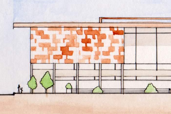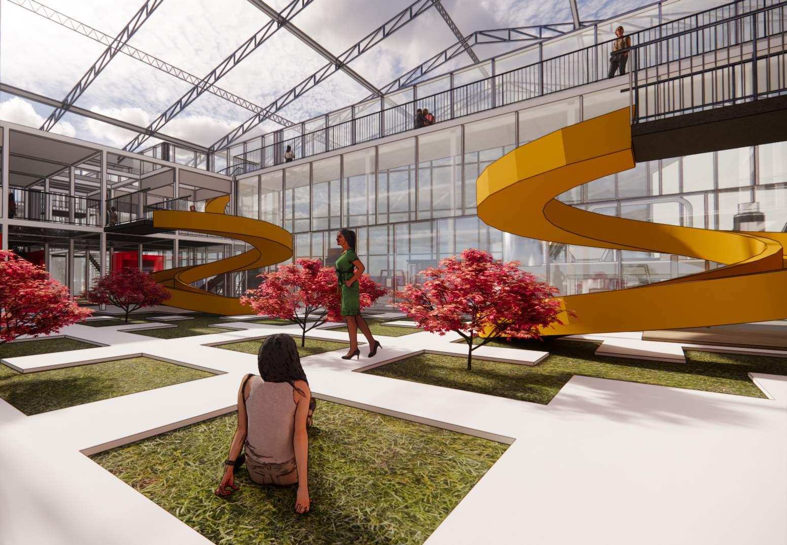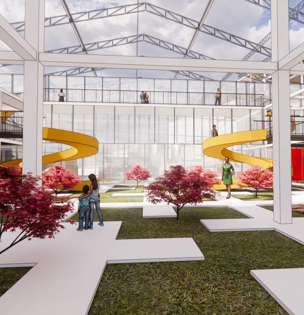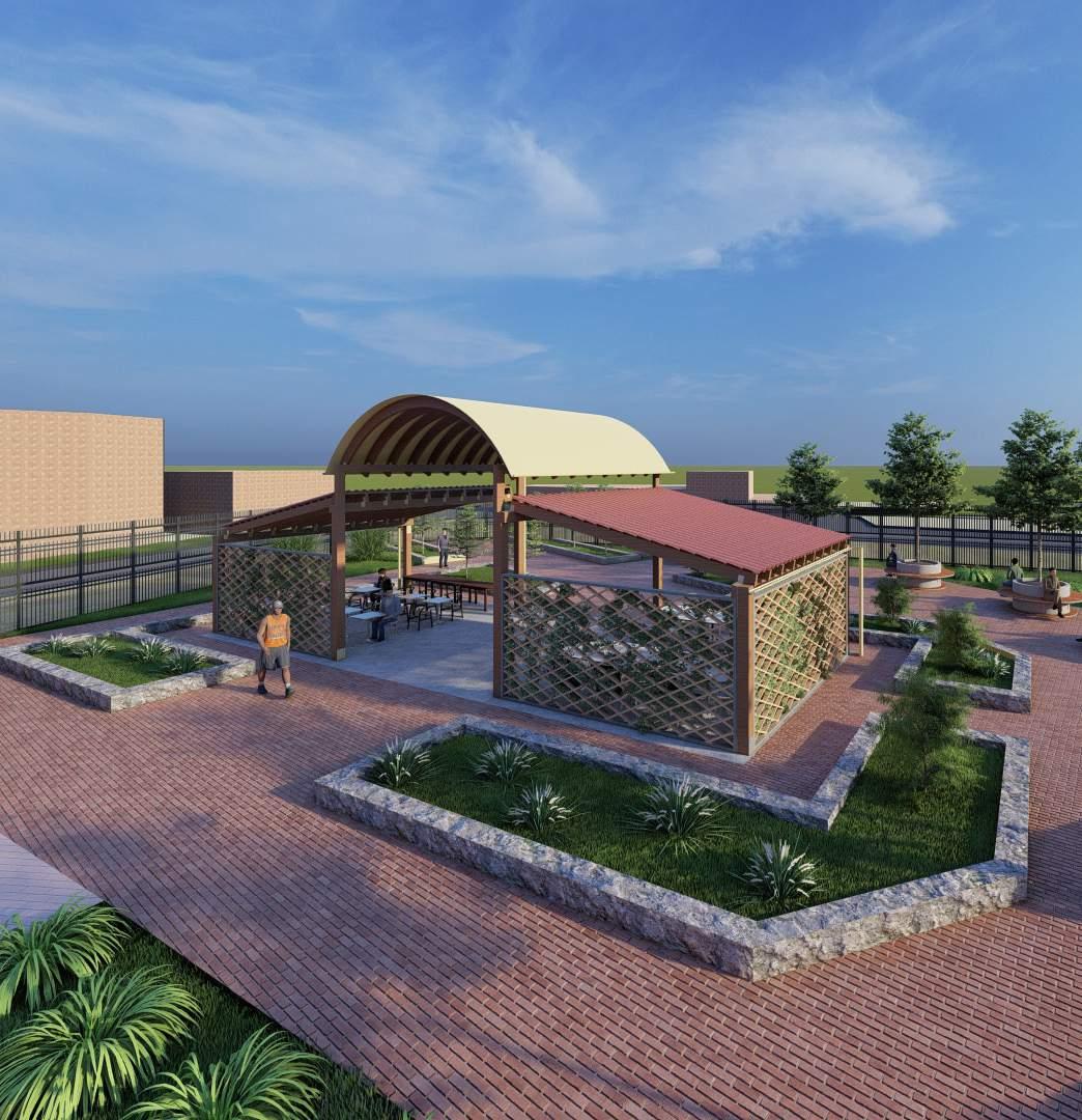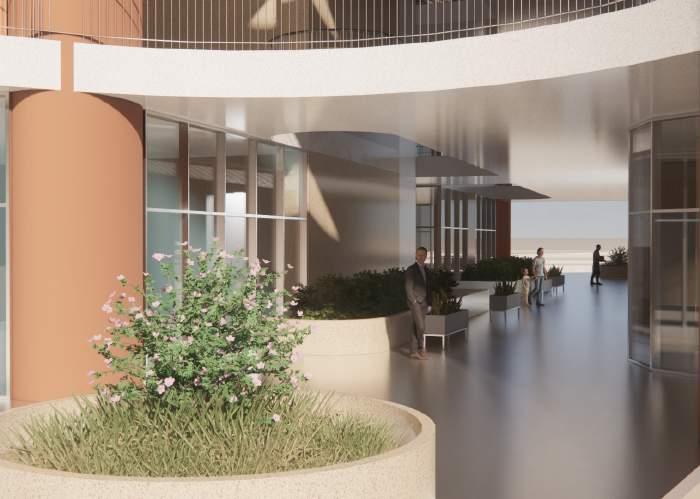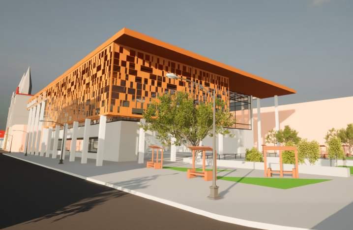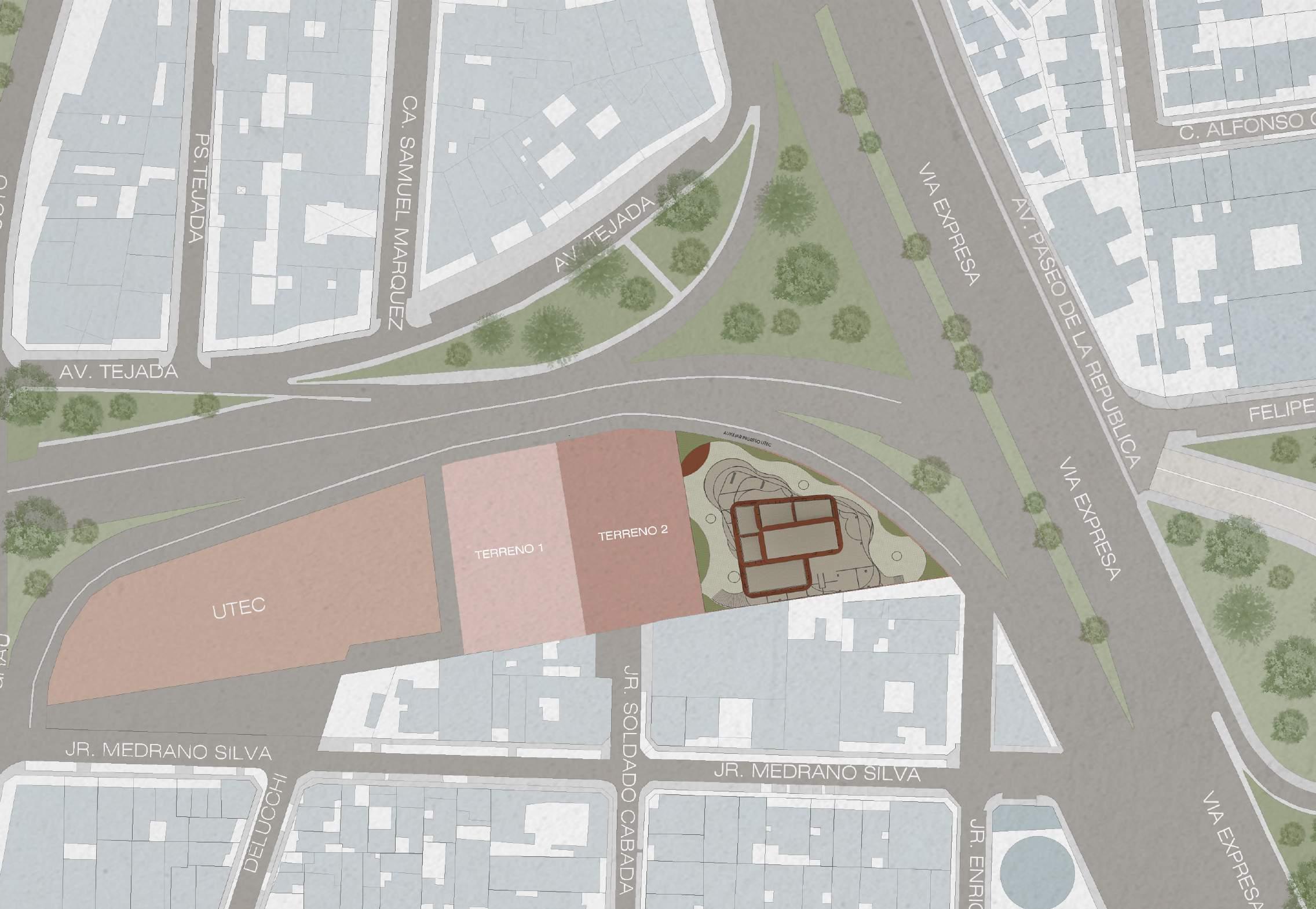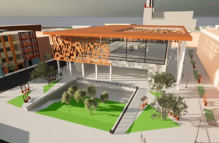 la plaza que mira hacia la Av. Arnaldo Márquez presenta una rampa que posibilita el acceso al sótano. Además, presenta terrazas escalonadas para descansar y/o realizar actividades públicas.