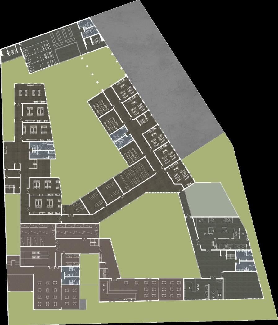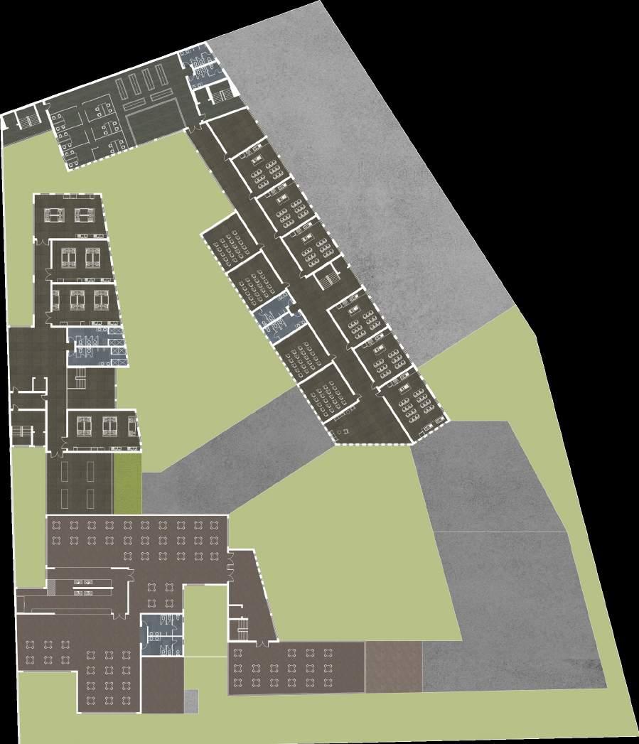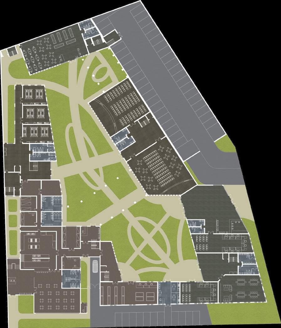 Se identifican 7 zonas delimitadas incluyendo el estacionamiento; siendo una de estas las zonas de aularios y de talleres, una biblioteca, una zona de recepción, zona administrativa, zona social y zona de acceso. Los primeros pisos están dedicados a las principales zonas de acceso, administración, zonas de lectura, SUMs, y talleres. Subiendo se encuentran las aulas teóricas, cubículos de estudio y áreas sociales. En los últimos pisos se encuentran áreas de estudio colectivo, talleres y aulas.