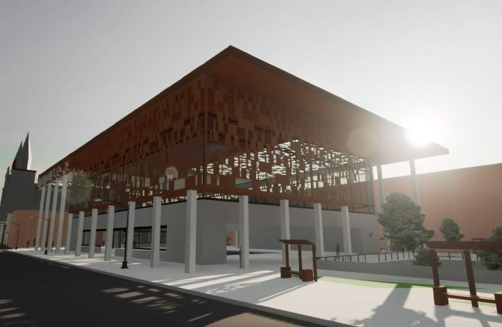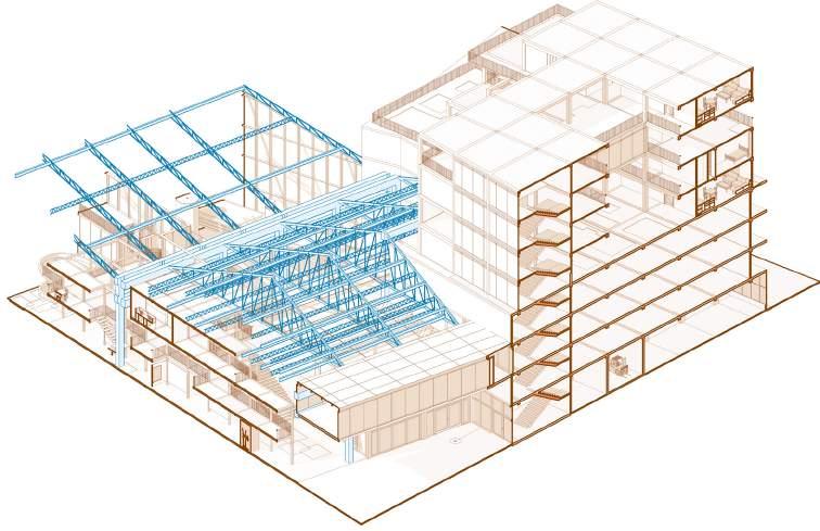 se muestran los diversos elementos aplicados. la piel metálica laminada que cubre la fachada ofrece un diseño estilizado, además de permitir transparencias y vistas únicas hacia los alrededores.