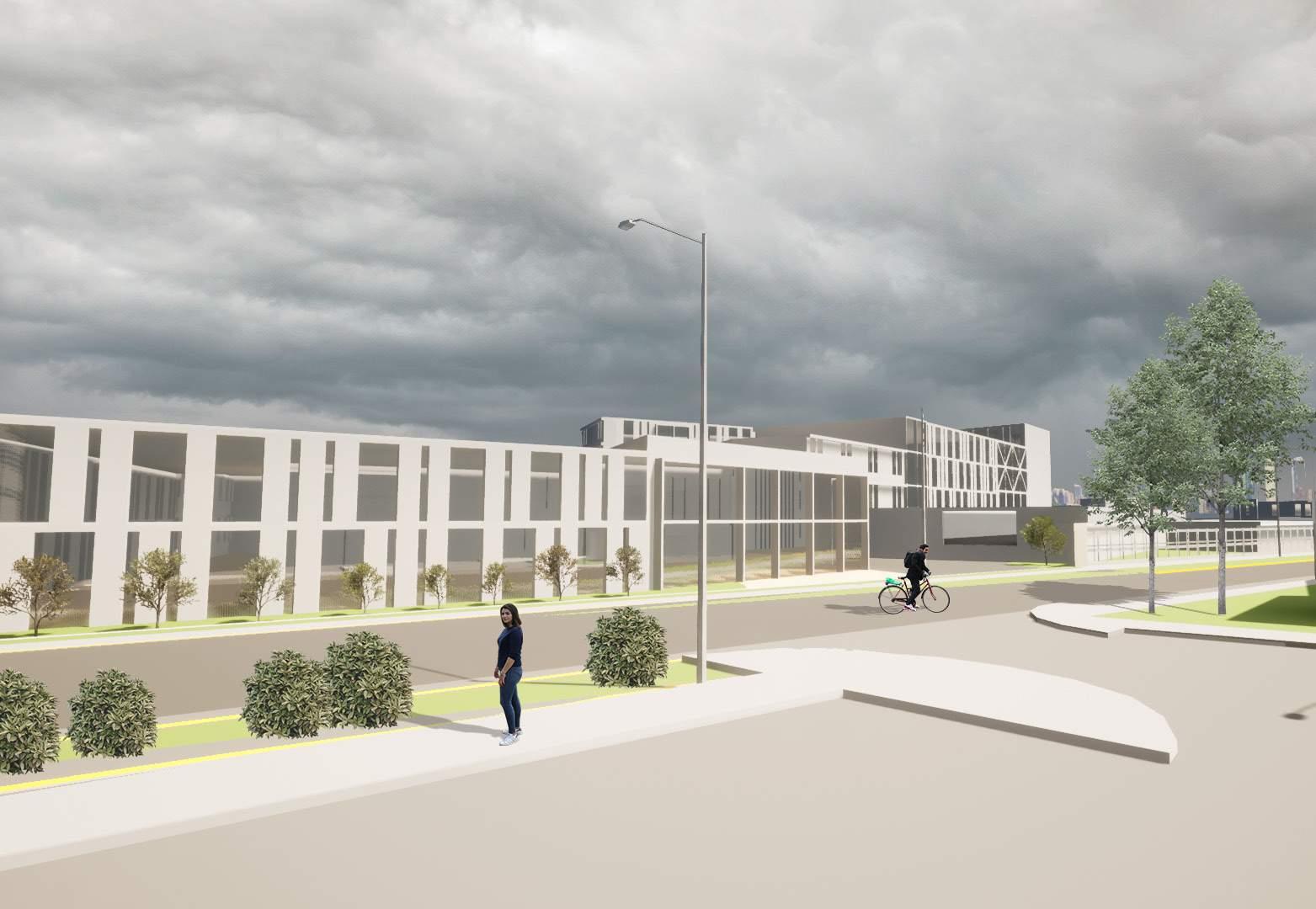 El acceso se ubica en la calle Paul Harris , una calle relativamente transitada. Para el proyecto se implementó un acceso de estacionamiento en el sótano, con un total de 79 estacionamientos habilitados para un aproximado de 1500 estudiantes al día.