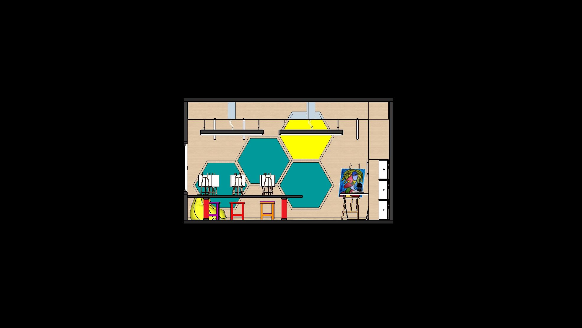 A sala possui uma marcenaria que contém nichos, armários e uma cuba para limpeza dos materiais utilizados, mesas de MDF brancas e os assentos em cores diversas. A escolha das cores faz referência ao estilo ‘’PopArt’’ surgido na década de 1950