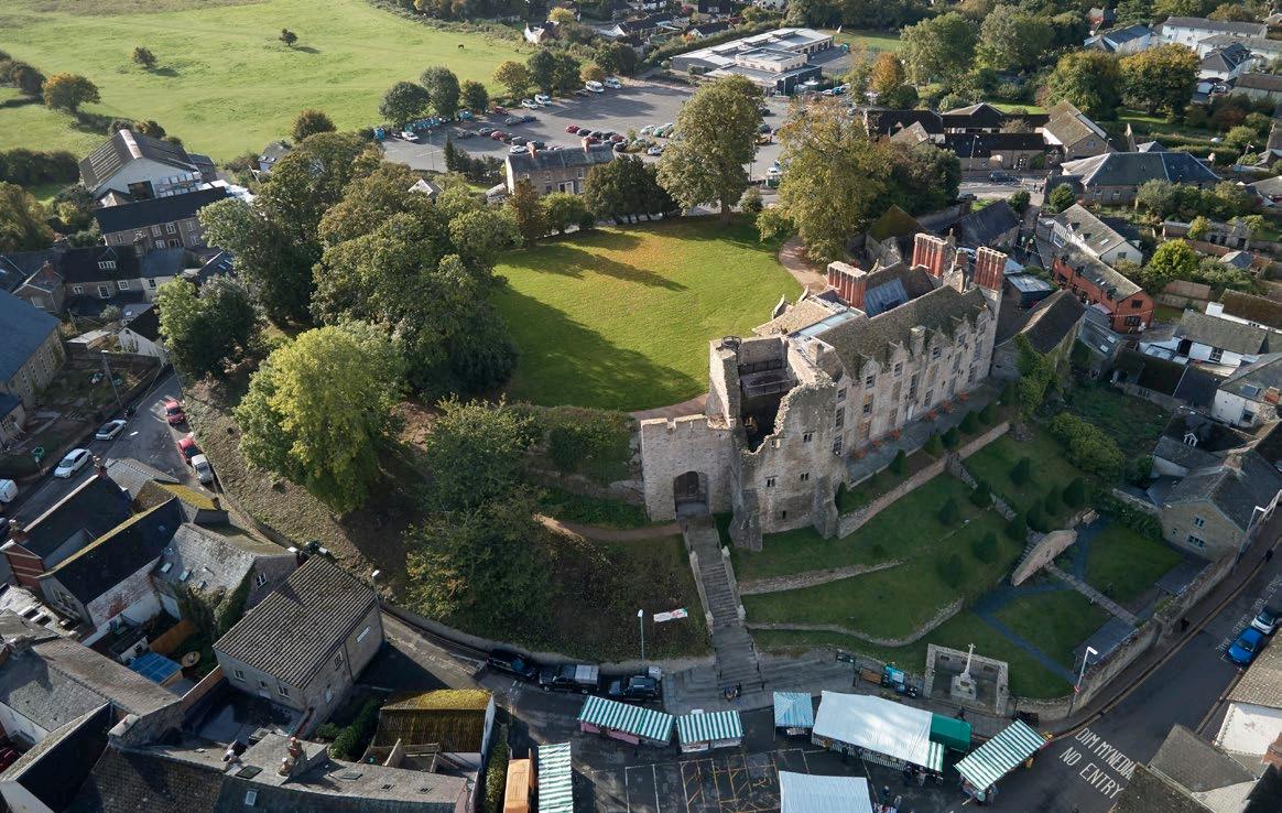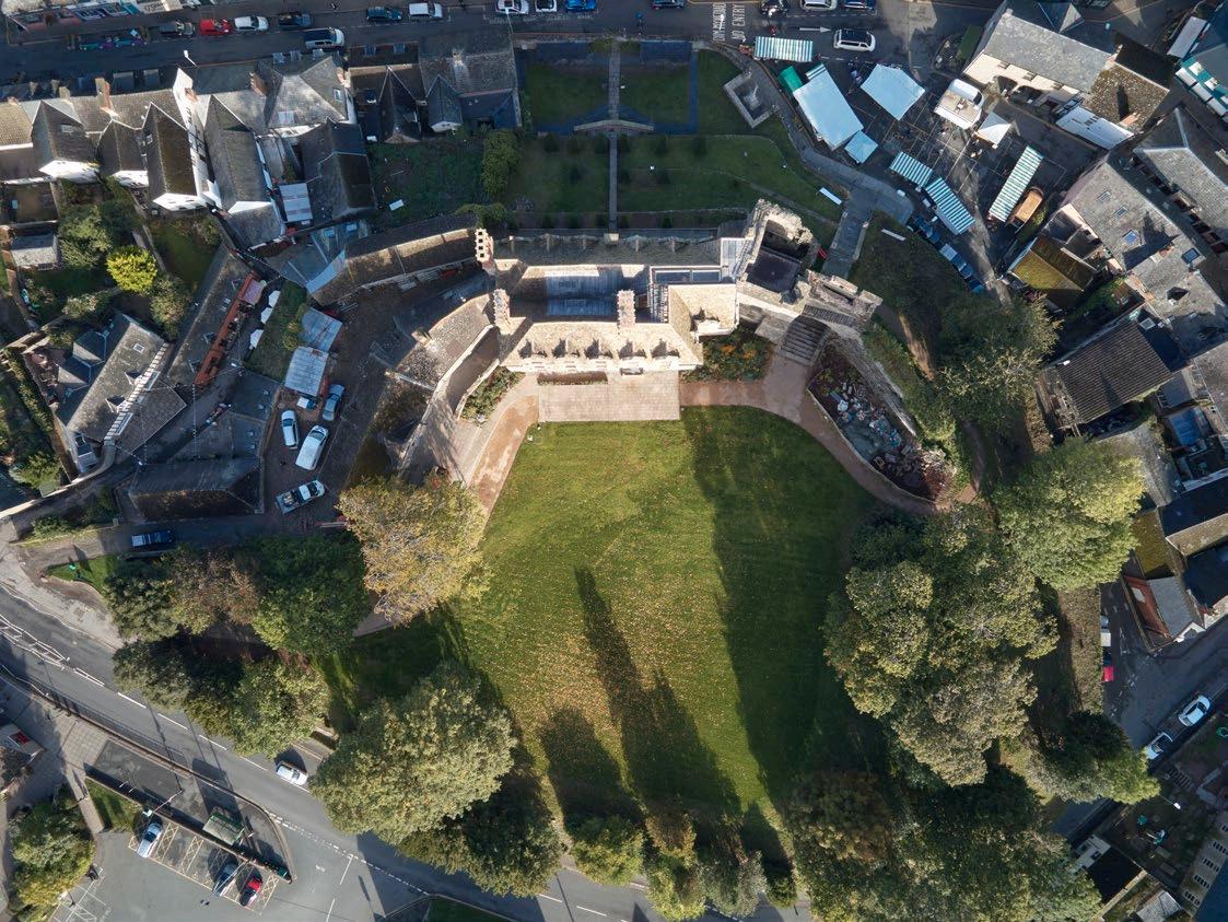 Aerial view of completed restoration of Hay Castle in the centre of Hay-on-Wye