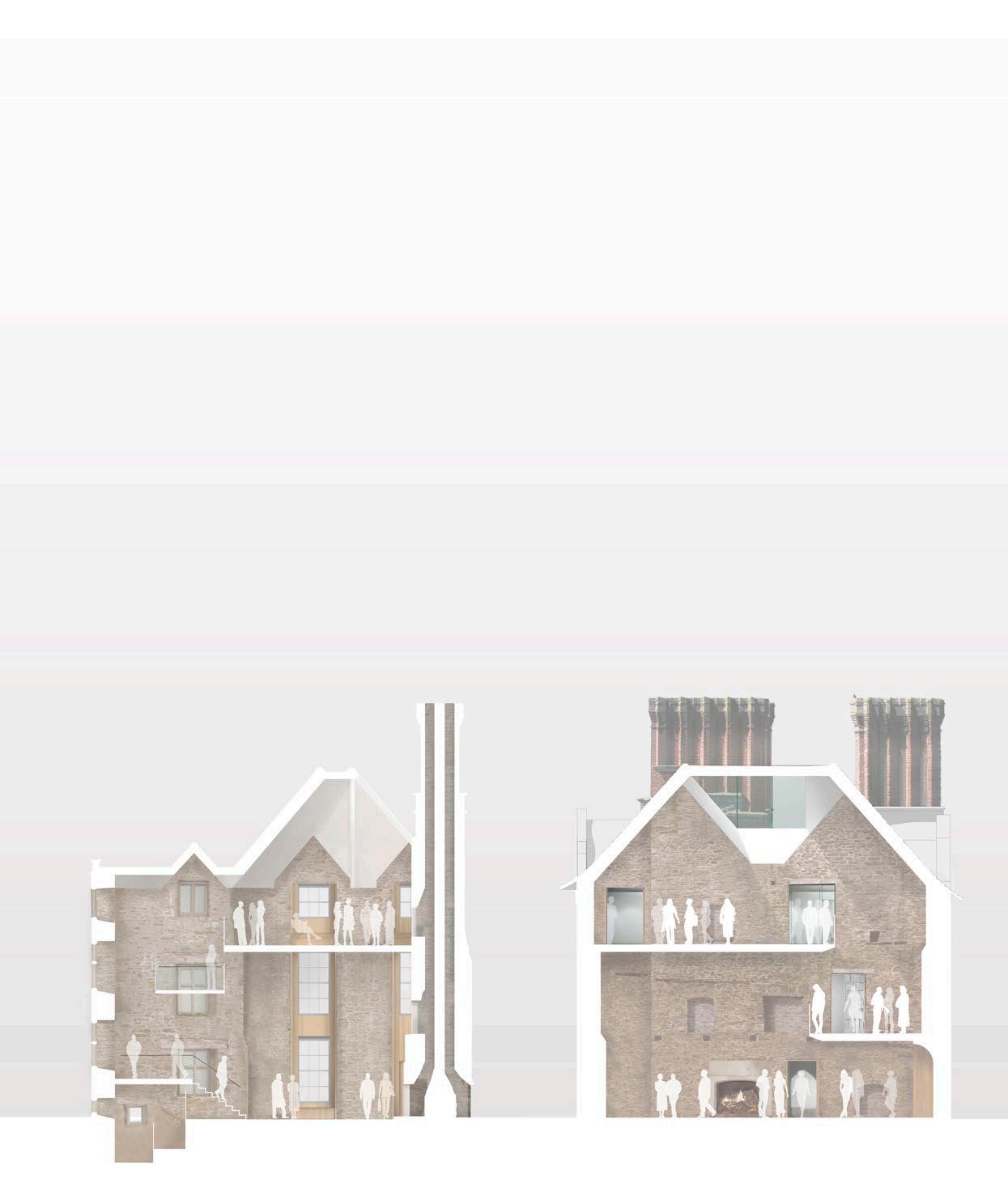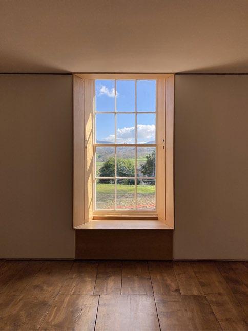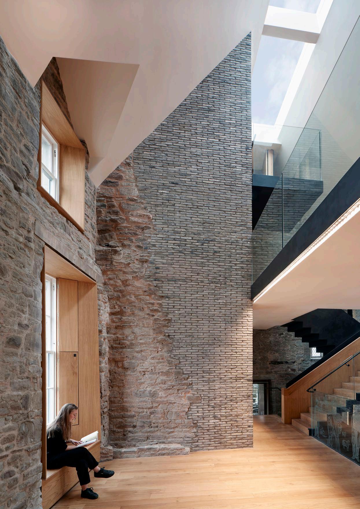 the building to retain the modest amount of heat introduced via new concealed radiators at upper floors and underfloor heating at ground. The repointed masonry walls remained uninsulated, allowing their mass to act as a heat sink whilst also ensuring moisture passes freely through. This passive strategy keeps the building healthy, avoiding damp in the structure, and regulates humidity within.