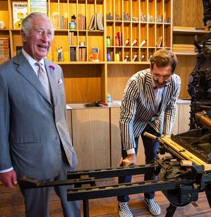 The Prince of Wales creates a lino print on the 1800s printing press at the official opening in July 2022
